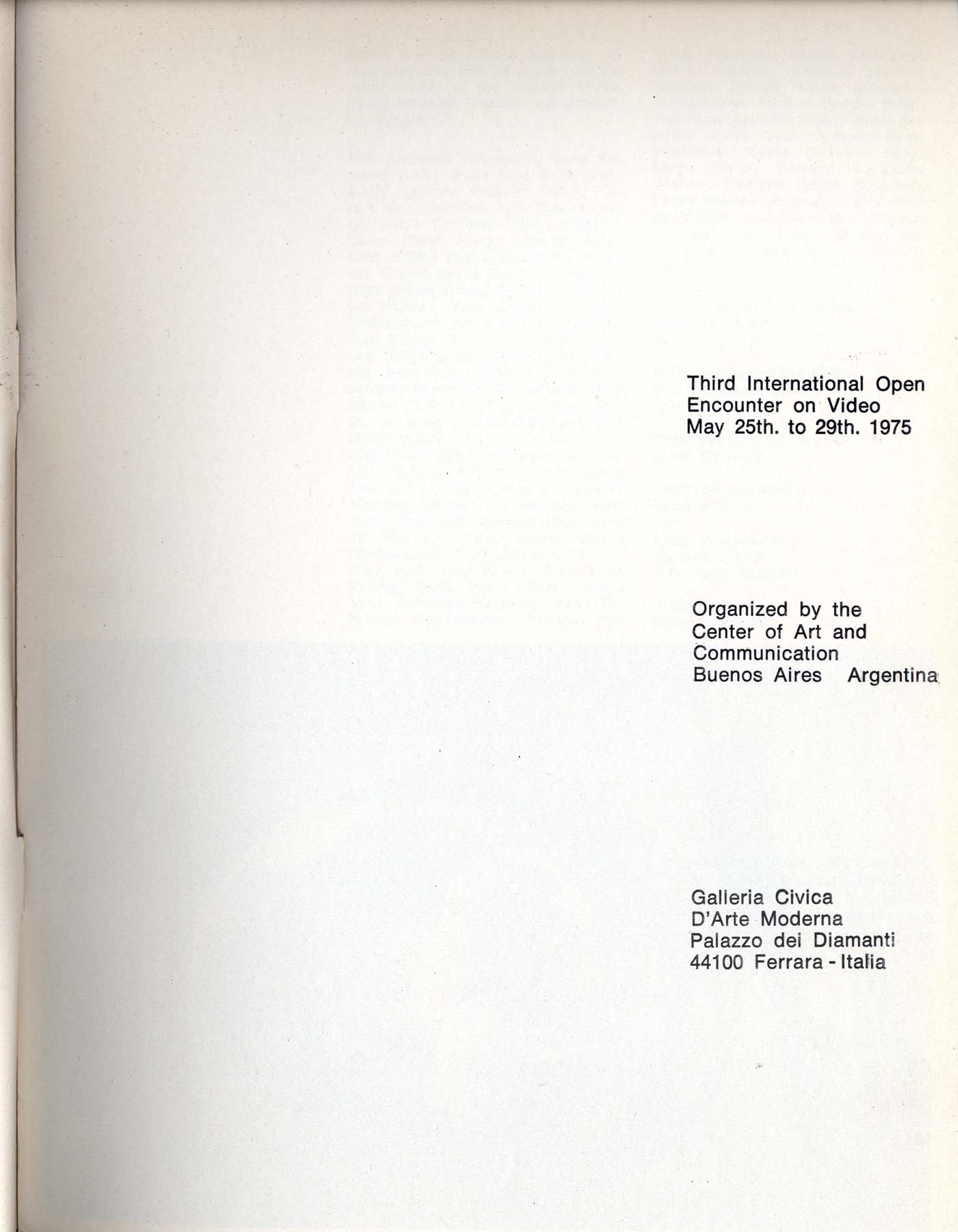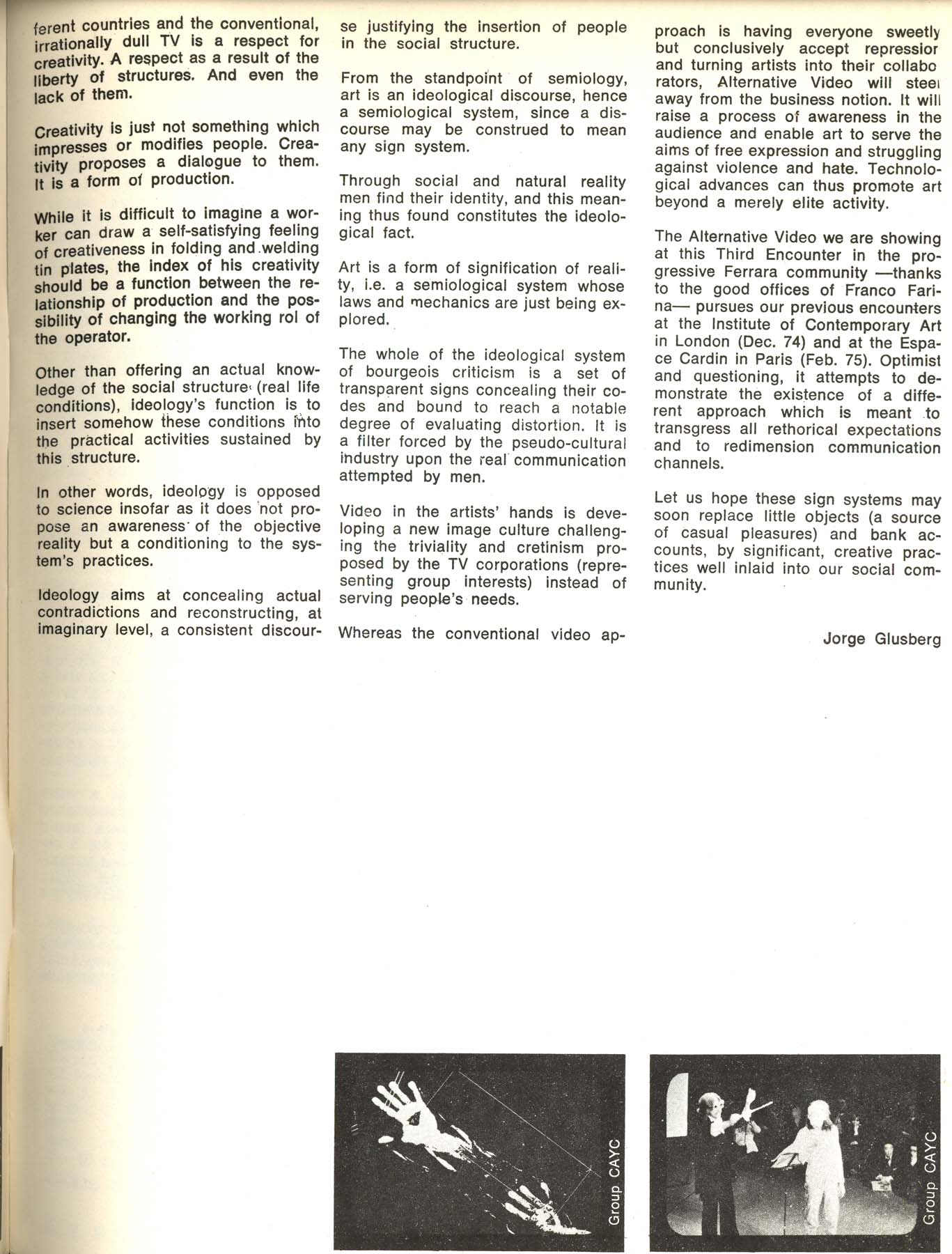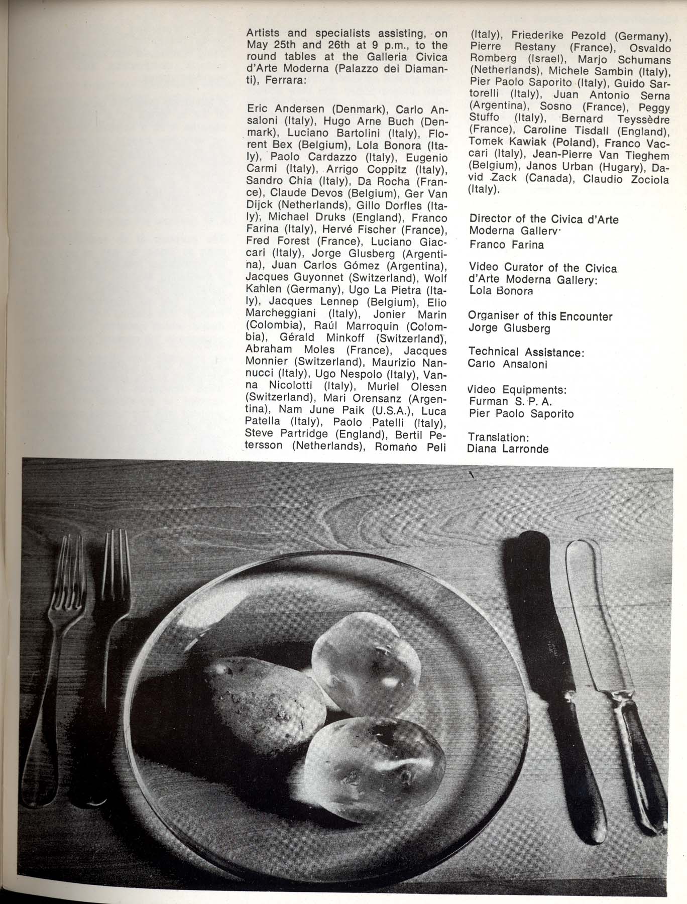 Texto de Glusberg: Agnetti, Albright, Alleyn, Altmann, Andersen, Antin, Baladi, Bauermeister, Bonnier, Bonora, Breloh, Bucan, Burgy, Byerley, Cardena, Carey, Cerberus, Clareboudt, Chartier, chia Davis, Davidovich, Druks, Ehrenberg, Environmedia Fabro, Fandangos, Fischer, Forest, Fox, Francis, Germana, Gerz, Gette, Giaccari, Giler, Goddamatch, Group OBM, Cayc - Vigo, Leonetti, Glusberg, Romero, Lujan Gutierrez, Giodia, Alvarez, Gomez, Torres, Veuirtas, Hastings, Bedel, Benedit, Dujovny, Ginzburg, Grippo, Marotta, Pazos, Pellegrino, Portillos, Romero, zabala- lavie, Lehr, Levine, Lombholt, Marchegiani, Marin, Marroquin, Matthys, Mattlacci, Matsusawa, Mc Millan, Mc Mullan, Mc Names, Mees, Mellnik, Merz, Minkoff, Montagu, Minujin, Moore, Morton, Mosconi, Myers, Nakaya, Nameth, Nespolo, Olesen, Paik, Paolini, Parmiggiani, Patella, Patelli, Pesce, Poweel, Pozzi, Rahn, Romberg, Richard, Rosenbach, Rosler, Salzman, Sartorelli, Sekula, Slede, Tarango, Telewissen, Tomek, Urban, Tissler, Van Es, Vazan, Yalkutm, Yamamoto. Romero participa en las obras: "Mass Media¨ (1972),