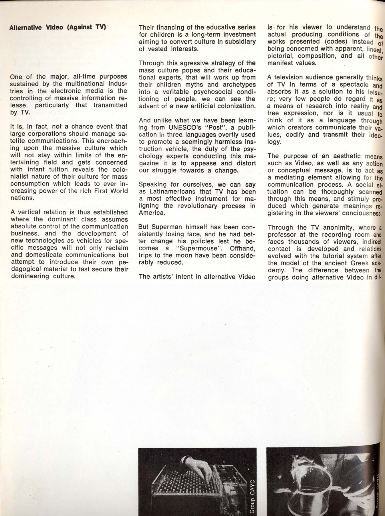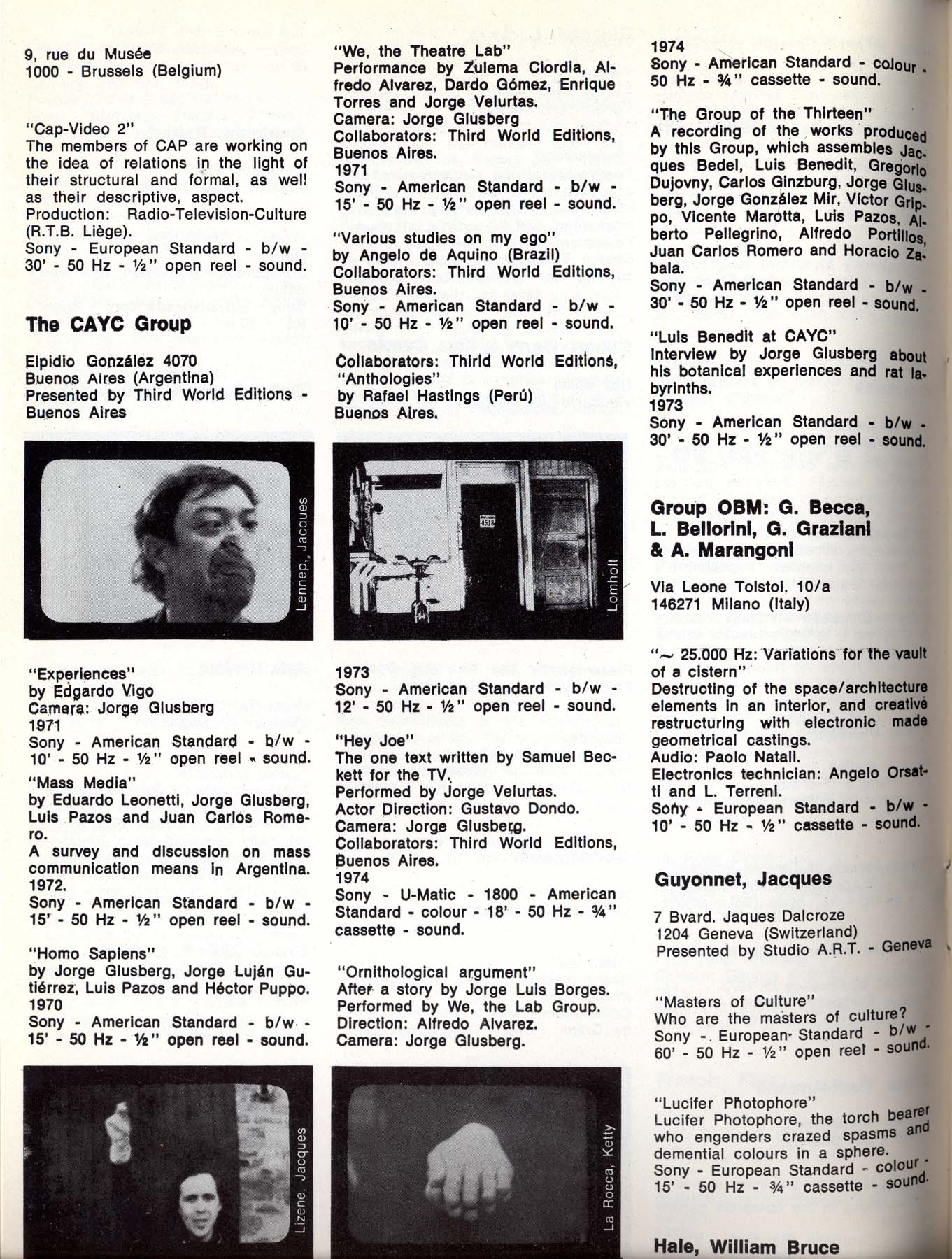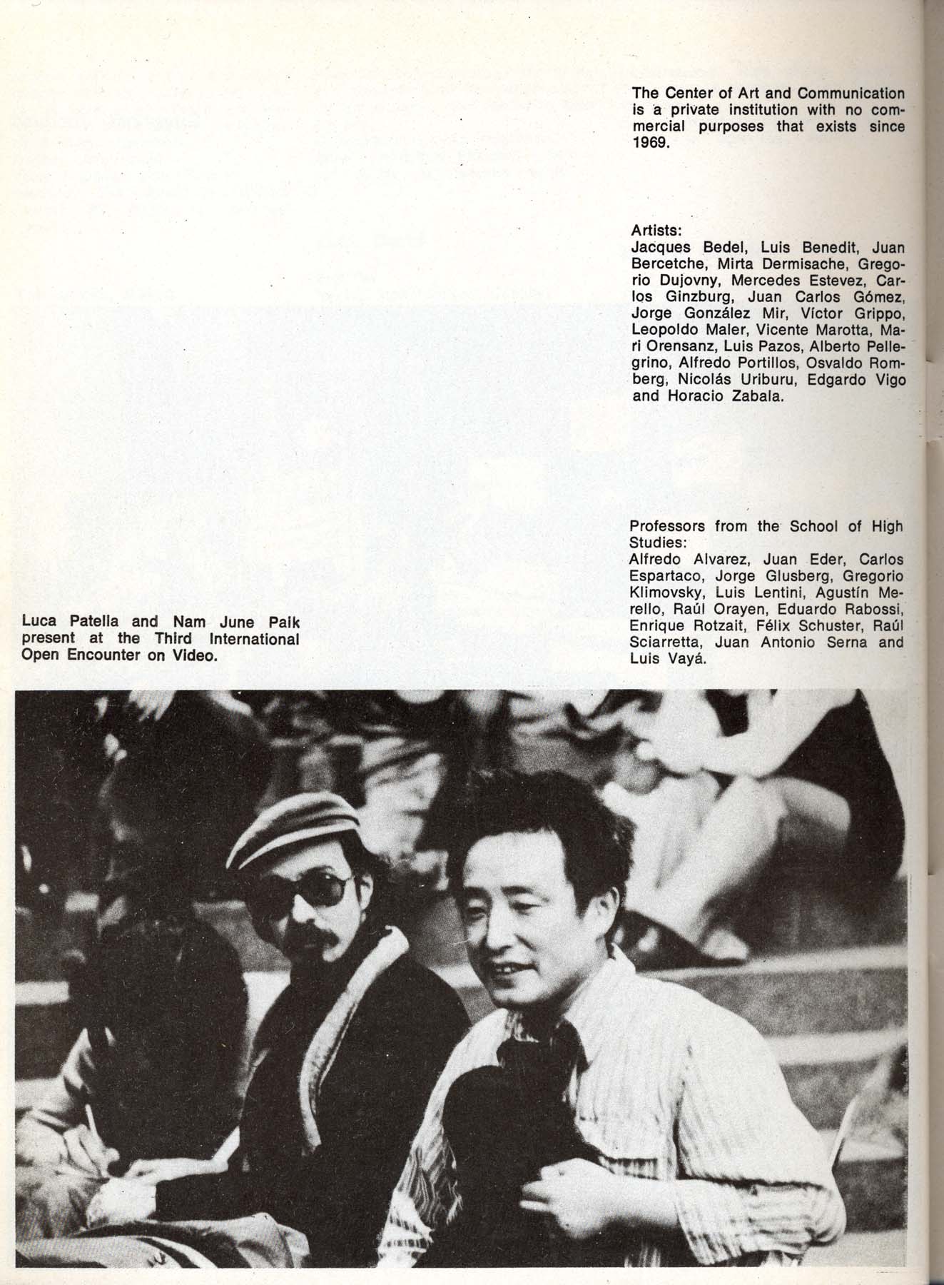 Texto de Glusberg: Agnetti, Albright, Alleyn, Altmann, Andersen, Antin, Baladi, Bauermeister, Bonnier, Bonora, Breloh, Bucan, Burgy, Byerley, Cardena, Carey, Cerberus, Clareboudt, Chartier, chia Davis, Davidovich, Druks, Ehrenberg, Environmedia Fabro, Fandangos, Fischer, Forest, Fox, Francis, Germana, Gerz, Gette, Giaccari, Giler, Goddamatch, Group OBM, Cayc - Vigo, Leonetti, Glusberg, Romero, Lujan Gutierrez, Giodia, Alvarez, Gomez, Torres, Veuirtas, Hastings, Bedel, Benedit, Dujovny, Ginzburg, Grippo, Marotta, Pazos, Pellegrino, Portillos, Romero, zabala- lavie, Lehr, Levine, Lombholt, Marchegiani, Marin, Marroquin, Matthys, Mattlacci, Matsusawa, Mc Millan, Mc Mullan, Mc Names, Mees, Mellnik, Merz, Minkoff, Montagu, Minujin, Moore, Morton, Mosconi, Myers, Nakaya, Nameth, Nespolo, Olesen, Paik, Paolini, Parmiggiani, Patella, Patelli, Pesce, Poweel, Pozzi, Rahn, Romberg, Richard, Rosenbach, Rosler, Salzman, Sartorelli, Sekula, Slede, Tarango, Telewissen, Tomek, Urban, Tissler, Van Es, Vazan, Yalkutm, Yamamoto. Romero participa en las obras: "Mass Media¨ (1972),