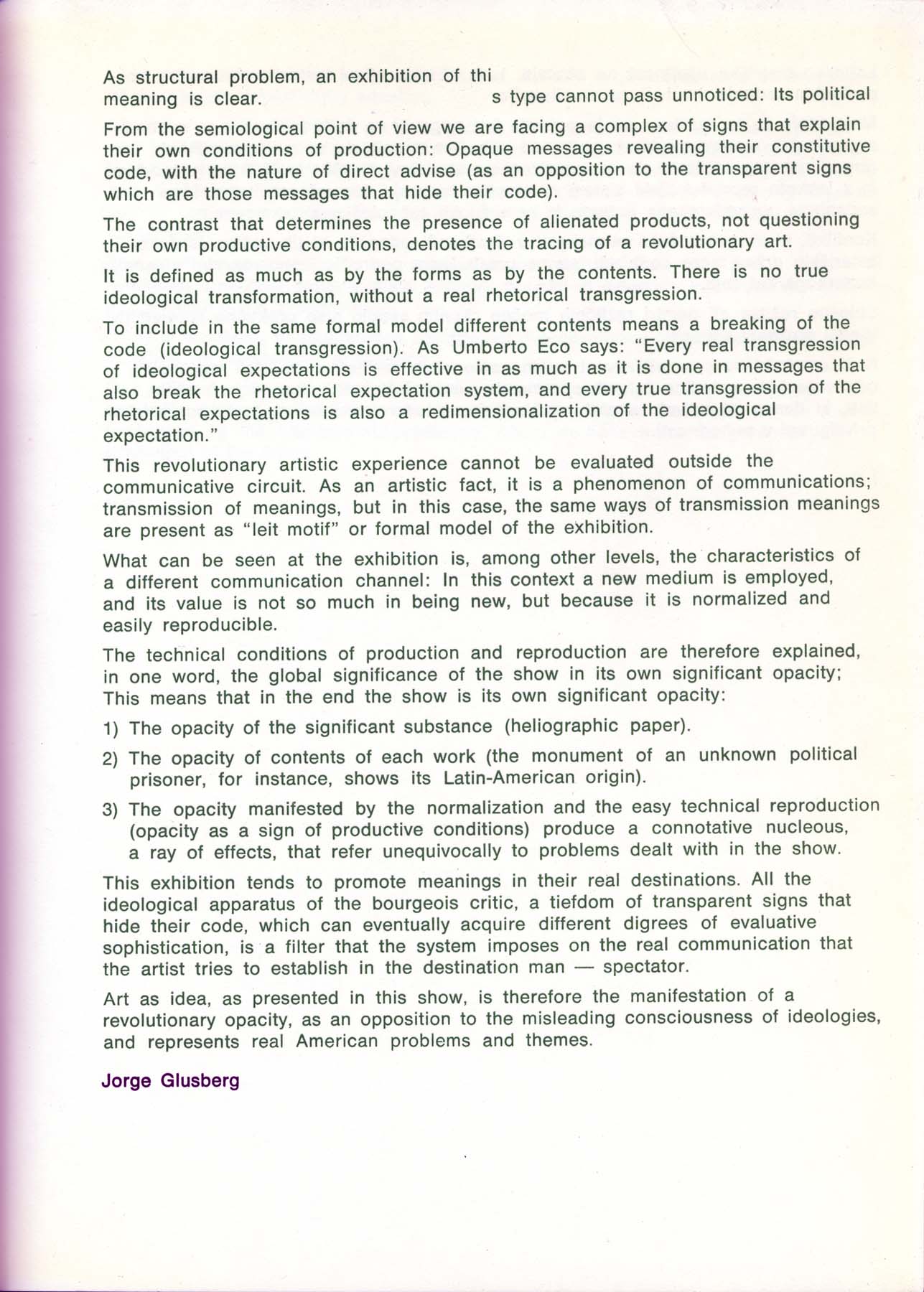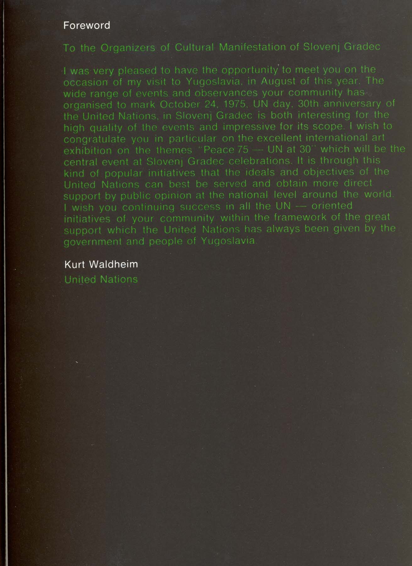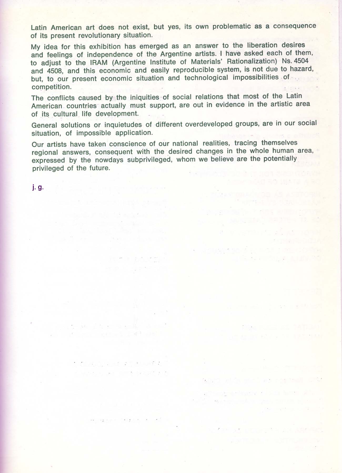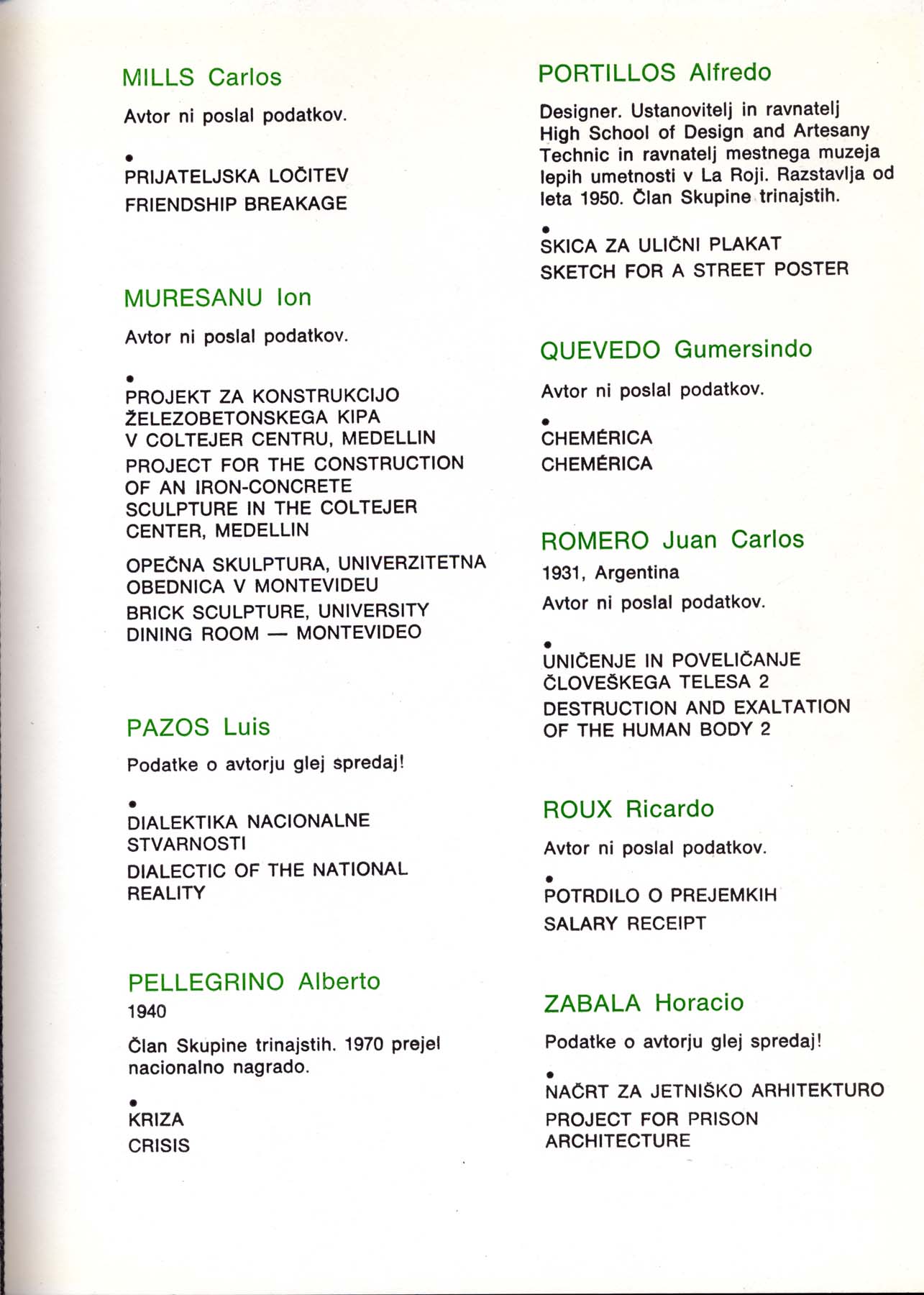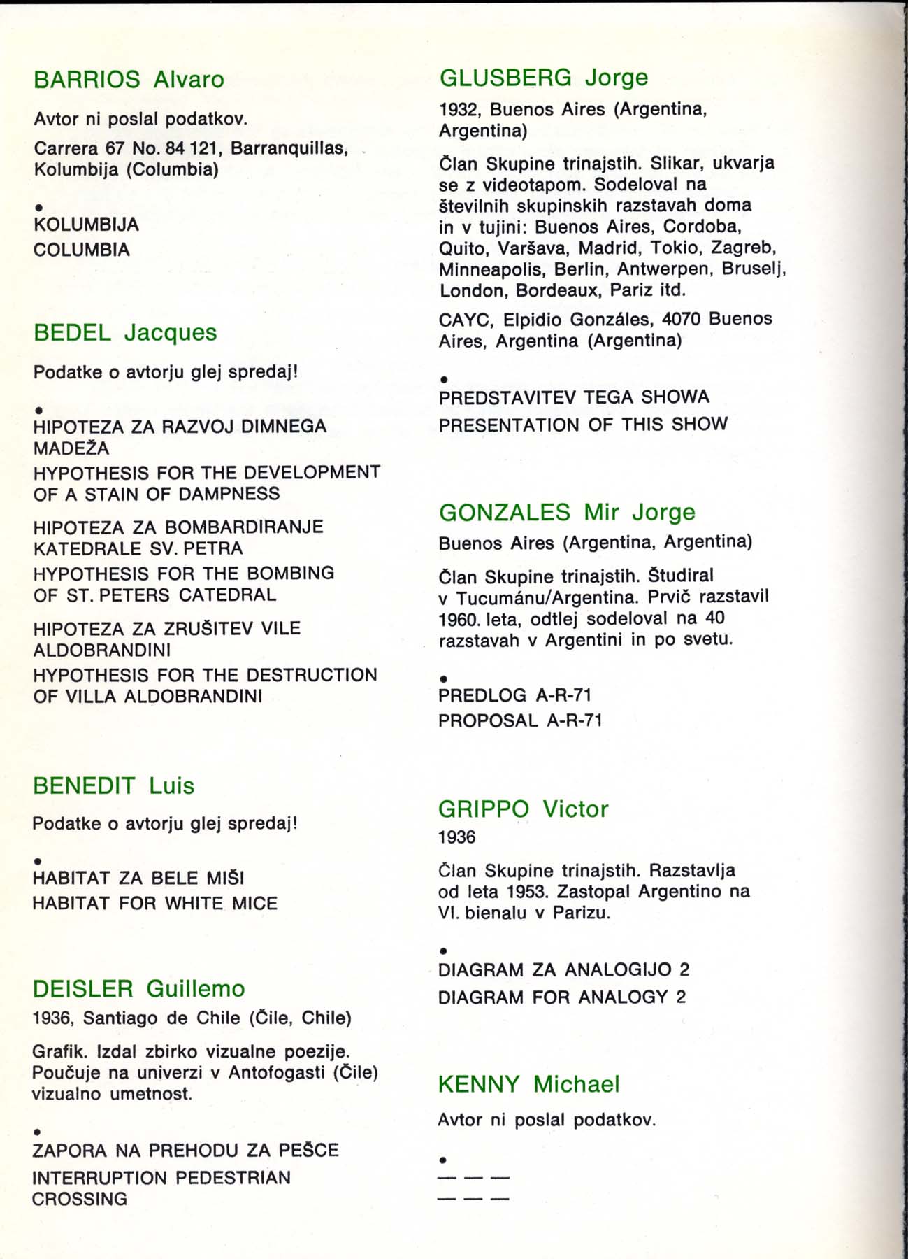 Exposición en Yugoslavia. Artistas Latinoamericanos Participantes: Barrios, Bedel, Benedit, Deisler, Glusberg, Gonzales, Grippo, Kenny, Mills, Muresani, Pazos, Pellegrino, Portillos, Quevedo, Romero, Roux, Zabala. Otros artistas Participantes: Almlöf, Alvaro, Anastasov, Anderle, Anzo, Apollonio, Aquino, Bacalov, Bal, Banga, Barrios, Barutovski, Berghe, Carra, Camporele, Carretta, Corfou, Corsini, Cugat, Cernigoj, Drake, Frangovski, Franta, Gabor, Guerrero, Hesselberth, Jaranov, Johnson, Kovatschev, Krasniansky, Kregar, Kwak, Labas, Lanier, Lesiak. Lind, Logar, Olsson, Orensanz, Pacheco, Plaza, Quevedo, Rosseland, Saray, Somoza, Tanay, Vuco, Walters