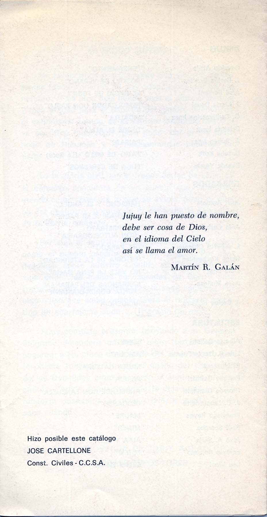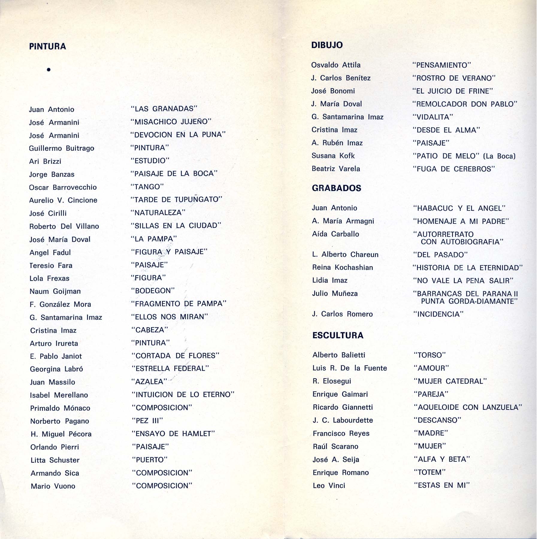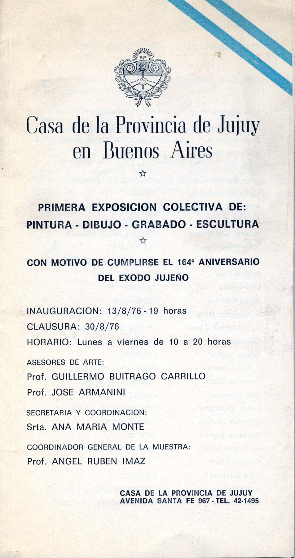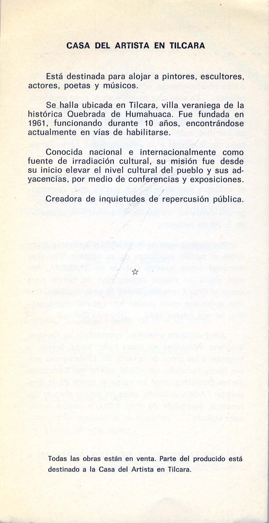 Tríptico. Participación de la exposición de : Aida Carballo, Julio Muñeza, Armainini José, Ari Brissi, Jorge Banzas, Robeto Del Villano, José María Doval, Cristina Imaz, Arturo Irueta, uan Massilo, entre otros. Participación con obra "incidencia". Dinero de las obras destinado a la Casa del artista en Tilcara