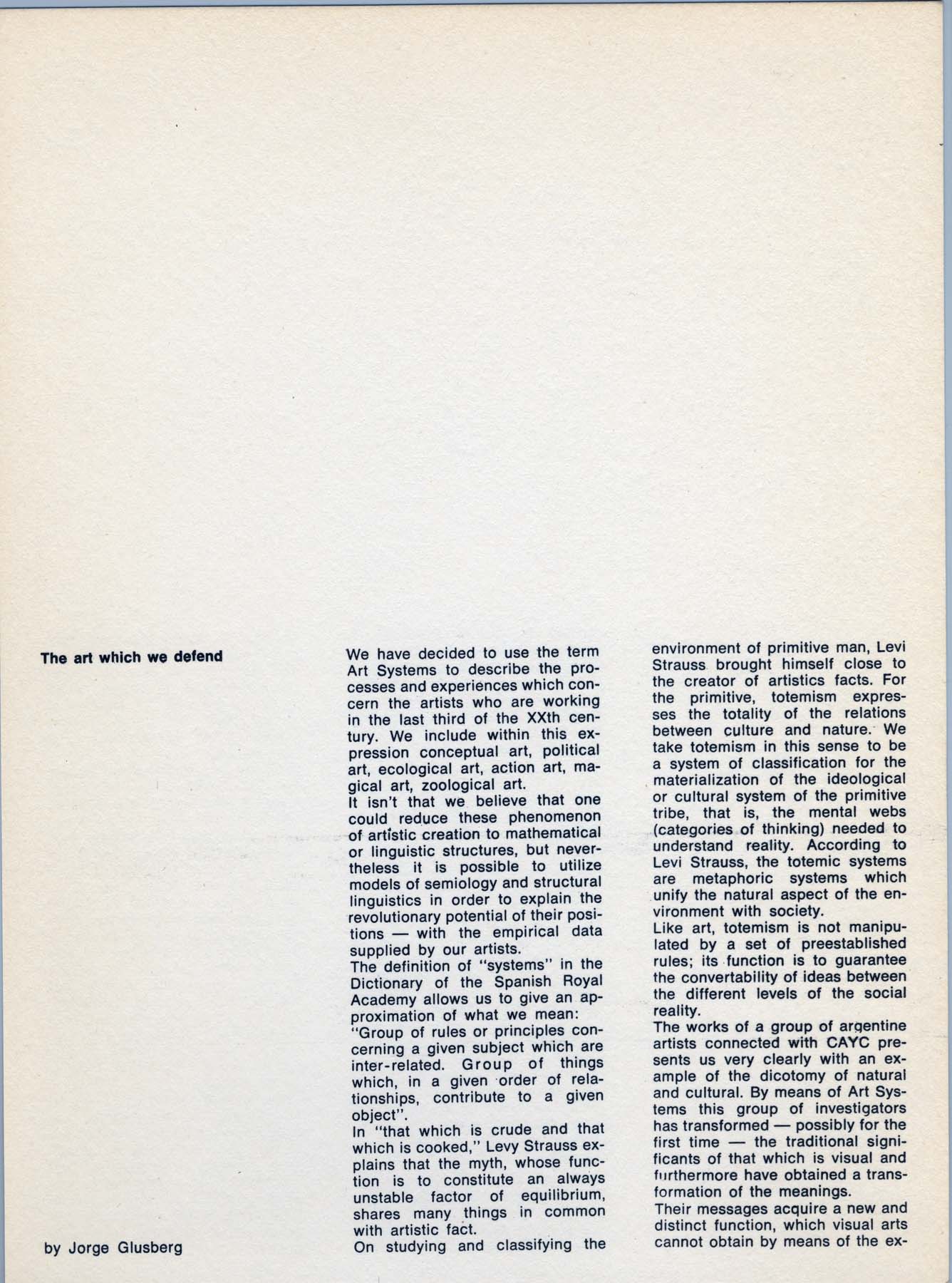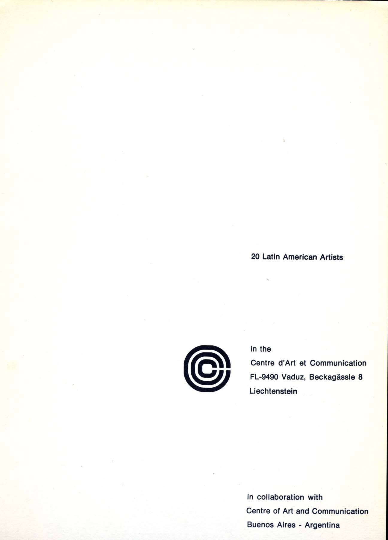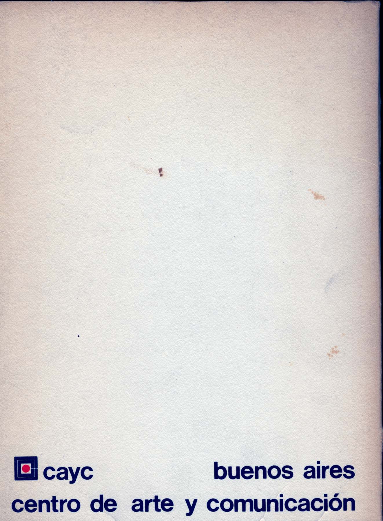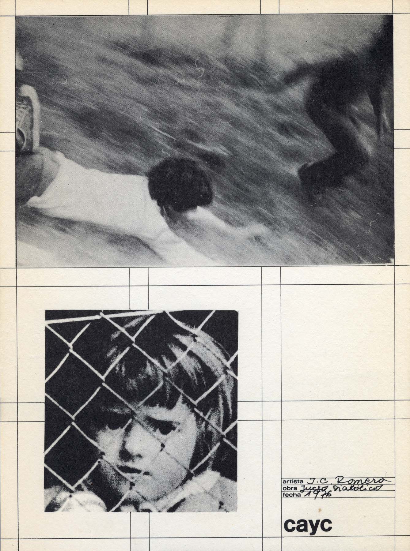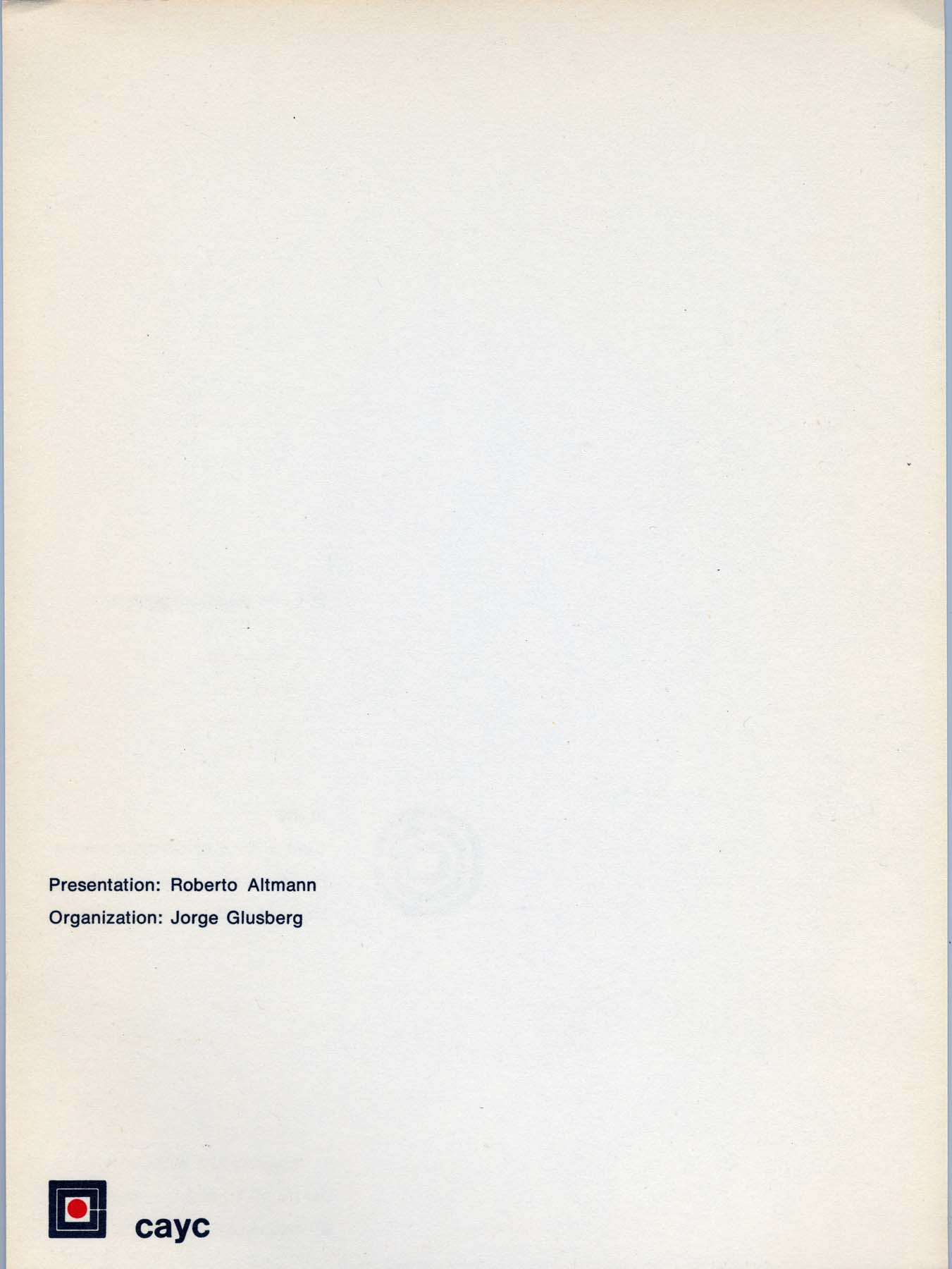 Carpeta con hojas. Cayc, Arte y Comunicación. Participan, entre otros: Alvaro, Benedit, Borla, Camporeale, Cugat, Dermisache, Esteves, Gómez, González, Mara, Orensanz, Obelar, Peluffo, Romberg, Romero, Tocci, Tozzi, Vigo, Zabala, Zelaya. Presentación: Roberto Altmann, Organización Jorge Glusberg. Texto de Glusberg "The art which we defend". Obra de JCR "Juegos Diabólicos"