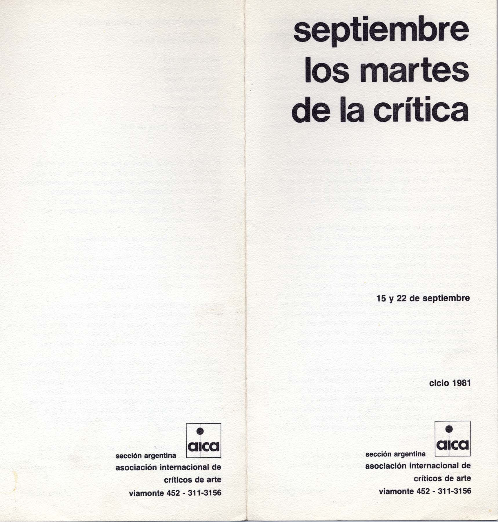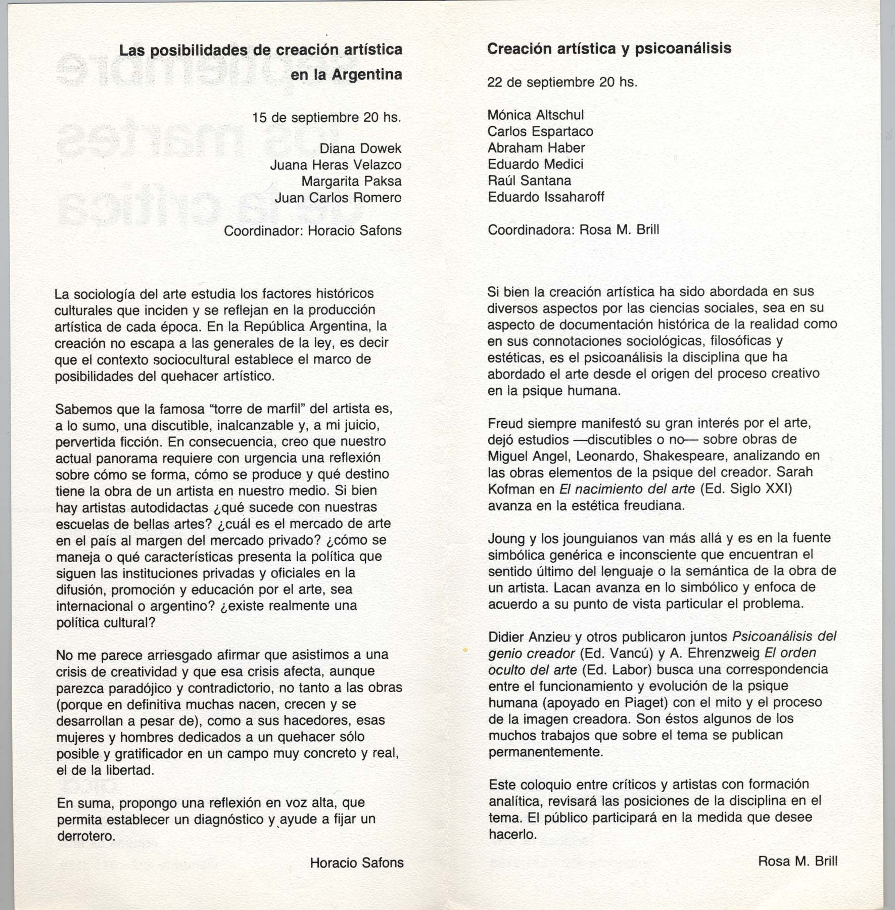 Textos de Horacio Safons, Rosa M. Brill. Mesa de diálogo "Las posibilidades de creación artística en la Argentina": Margarita Paksa, Diana Dowek, Juana Heras Velazco. La charla, en el mismo ciclo, "Creación artística y psicoanálisis": a cargo de Rosa M. Brill y con la participación de Mónica Altschul, Carlos Espartaco, Abraham Haber, Eduardo Médici, Raúl Santana, Eduardo Issaharoff