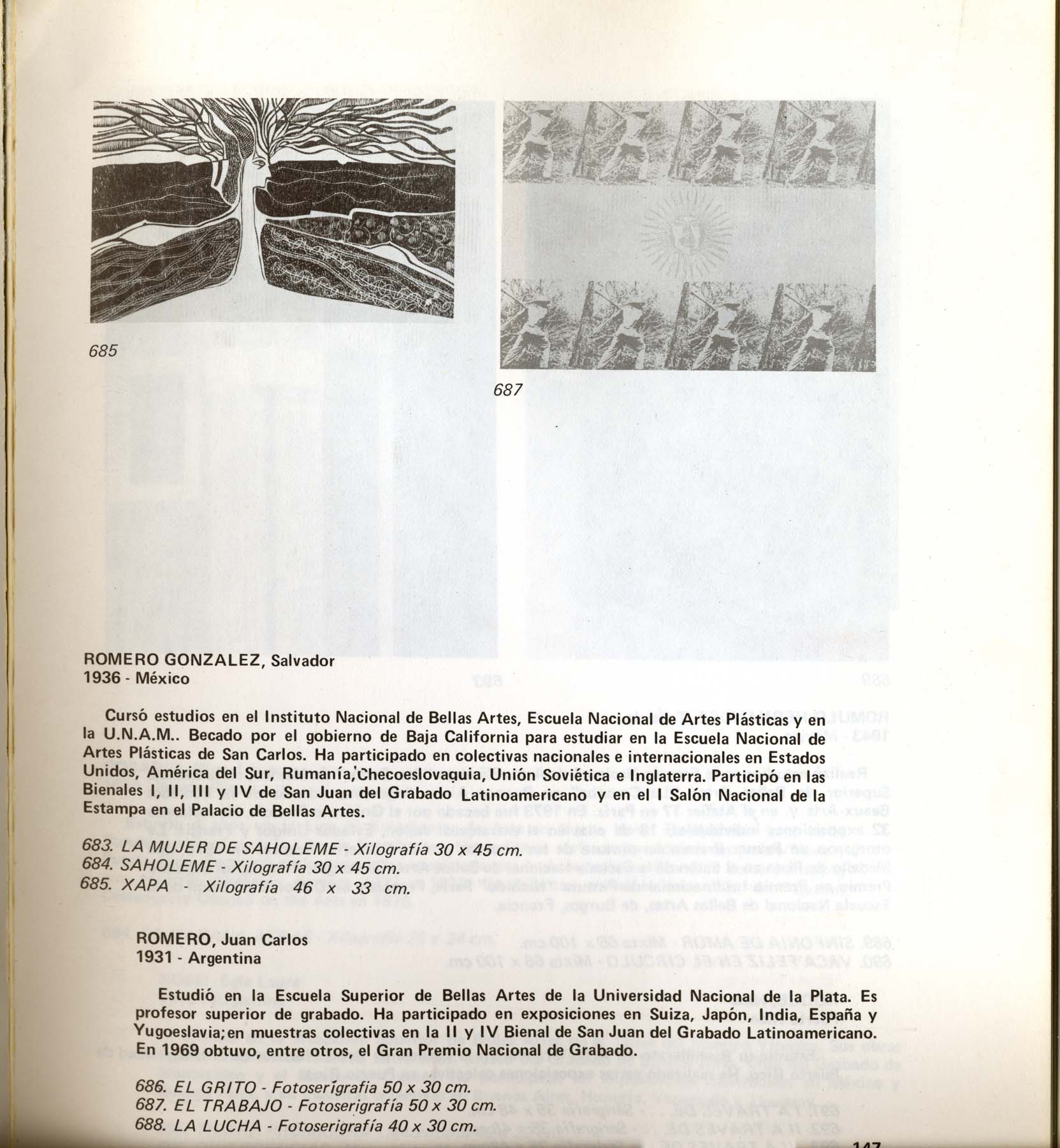 Juan Carlos Romero participa con las obras "El grito", "El trabajo" y "La Lucha". Participan, entre otros artistas: Abularach, Aburdo, Adasme, Afamado, Aguirre, Alvarado, Álvarez, Alvador, Ansueta, Armagni, Ayala, Ballester, Basso, Bastos, Batorska, Bechara, Belmar, Bernal, Bernades, Berroa, Bessoudo, Blinder, Brandt, Cabra, Camacho, Camnitzer, Campos, Cano, Cardenas, Cardillo, Carmenes, Cabra, Castro, Cerrato, Cury, Cruz, Damast, David, Delano, Diaz, Duran, Estrada, Faunes, Flemming, Gato, Gil, Giorgi, Gomez, Godoy, Goldberg, Goncalves, Gonzalez, Grau, Grondona, Gutiérrez, Hermano, Hernandez, Huertas, Israel, Jaramillo, Jimenez, Jonic, Keli, Lobo, Lozano, Luna Ercilla, Luppi, Maradiaga, Martinez, Maxera, Monroy, Mogollon, Monsalve, Montiel, Morales, Moura, Muñoz, Nacif, Nakakubo, Nardin, Ojeda, Olivera, orlando, Ortiz, Ortiz, Ortiz Pozo, Osorio, Pacheco, Porter, Portugal, Prieto, Pujol, Rincon, Rivera, Roman Prado, Rubli, Salcedo, Salgado, Scannapieco, Suarez, Solis, Sueldo, Tarantino, Testoni, Toral, Torrecillas, Uhart, Villalobos, Vieytes, Zabala, Zapata, Zar.