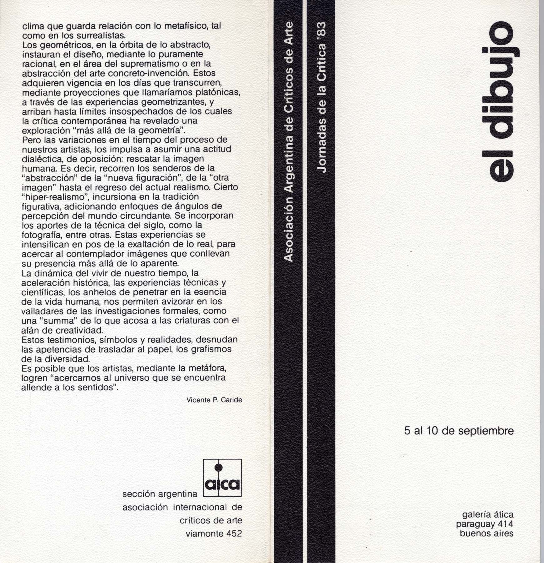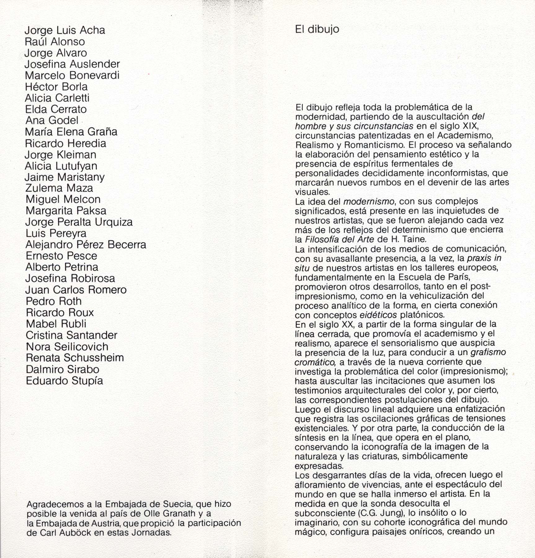 Texto de Vicente Caride. Participación de artistas: Acha, Aisenbeg, Aizemberg, Siqueiros, Alonso, Audivert, Benedit, Bedel, Burton, Cerrato, Coppola, Distéfano, Dowek, Kuitca, Porter, Portillo, Portinari, Santander, Xul Solar, Stupía, entre otros. Participación de las galerías y museos: La nueva imagen, Museo Nacional de Bellas Artes, CAYC, Museo de Arte Moderno, centro cultural perspectiva surrealista, Centro de Arte y Comunicación de la década del 70', Galería del retiro El collage, Galería Arte Nuevo, Geometrías, Galería Rubbers, Escultura III, Galería del Buen Ayre La Joven Generación, Galería Capelli-Centoira, Maestros Latinoamericanos, Galería Vermeer, La postfiguración, Galería Tema el dibujo, Galería Ática arte y diseño, diseño y arte, Galería Hilda Solano, Premio Prilidiano Pueyrredon, Hotel Libertador, Arte Textil, Galería el Mensaje