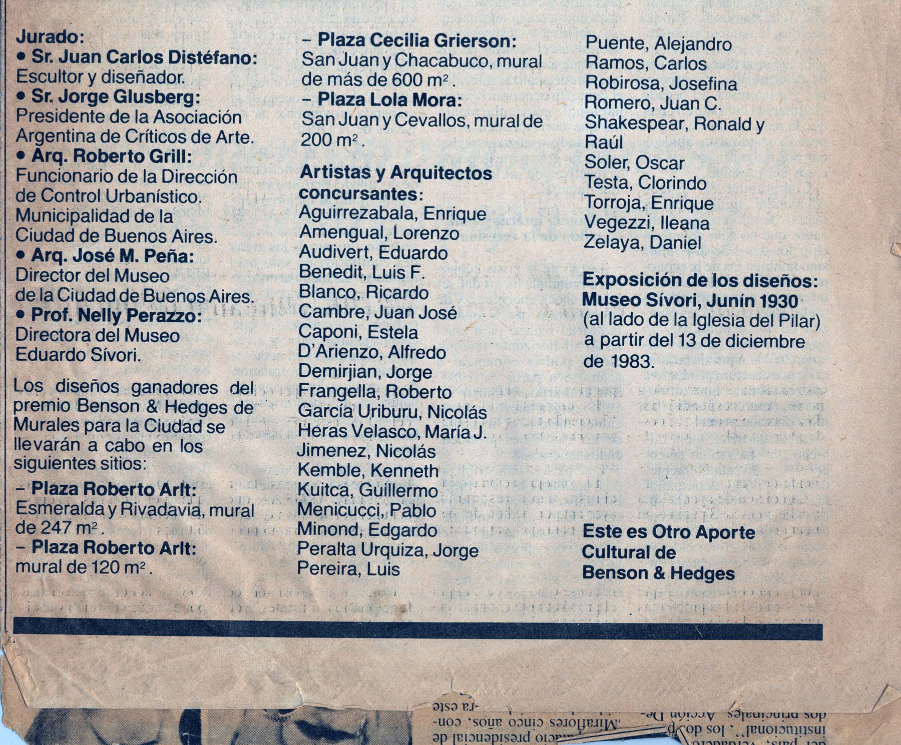 Jurado: Juan Carlos Distéfano, Jorge Glusberg, Roberto Grill, Nelly Perazzo. Artistas y arquitectos concursantes: Audivert, Benedit, Kemble, Kuitka,Shakespear, Testa, entre otros. Coordinador Américo Castilla.