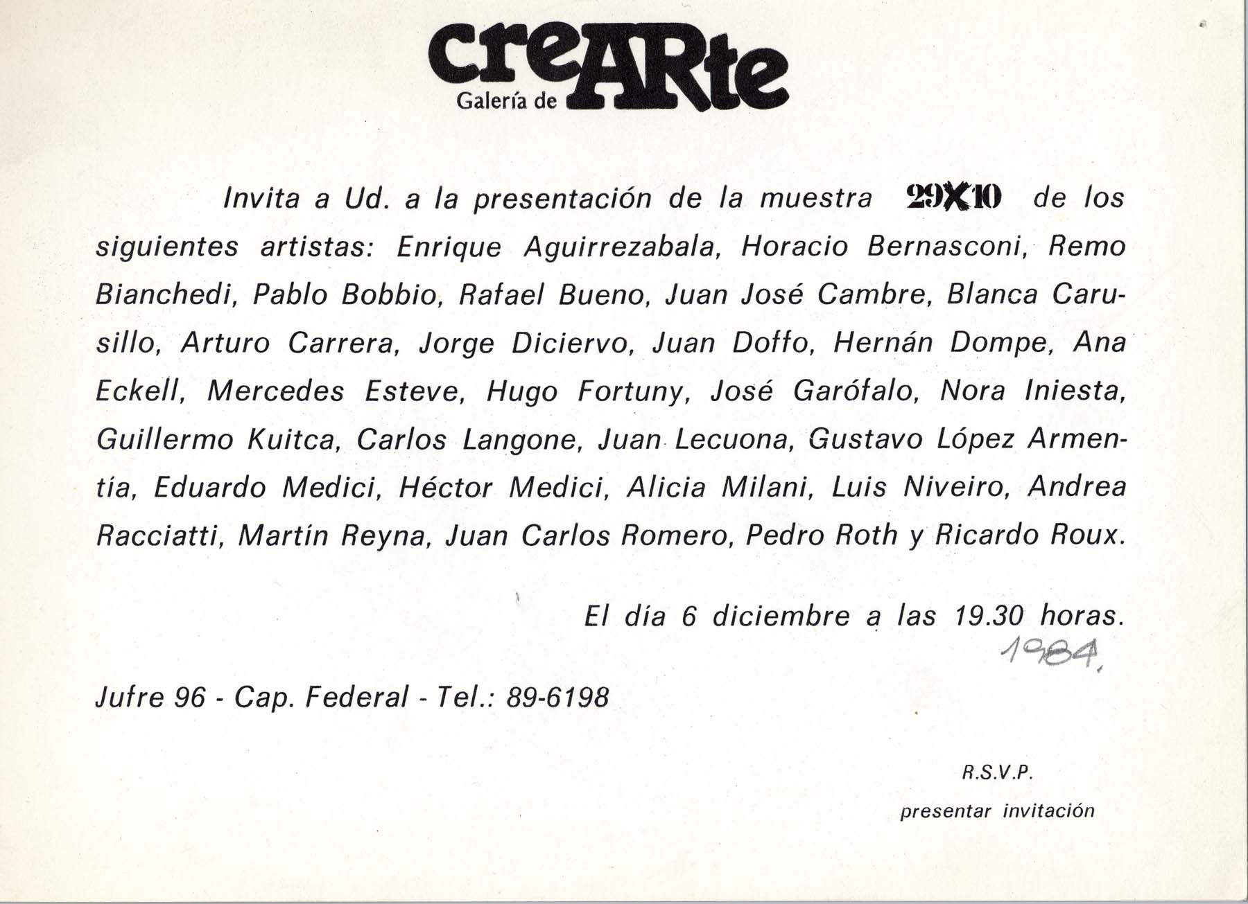 participan: Aguirrezabala, Bernasconi, Bianchedi, Bobbio, Bueno, Cambre, Carusillo, Carrera, Diciervo, Doffo, Dompe, Eckell, Esteve, Fortuny, Garófalo, Iniesta, Kuitca, Langone, Lecuona, López Armentia, Medici, Milani, Niveiro, Racciatti, Reyna, Romero, Roth, Roux.