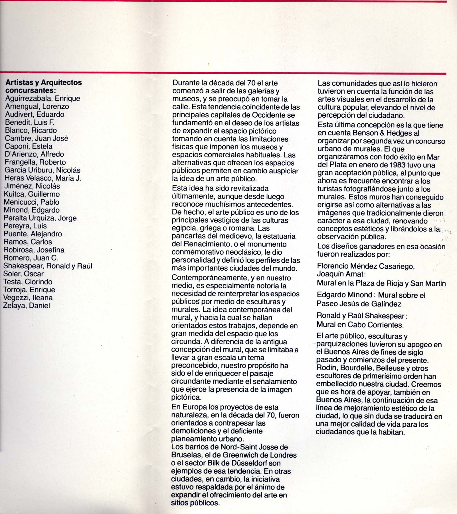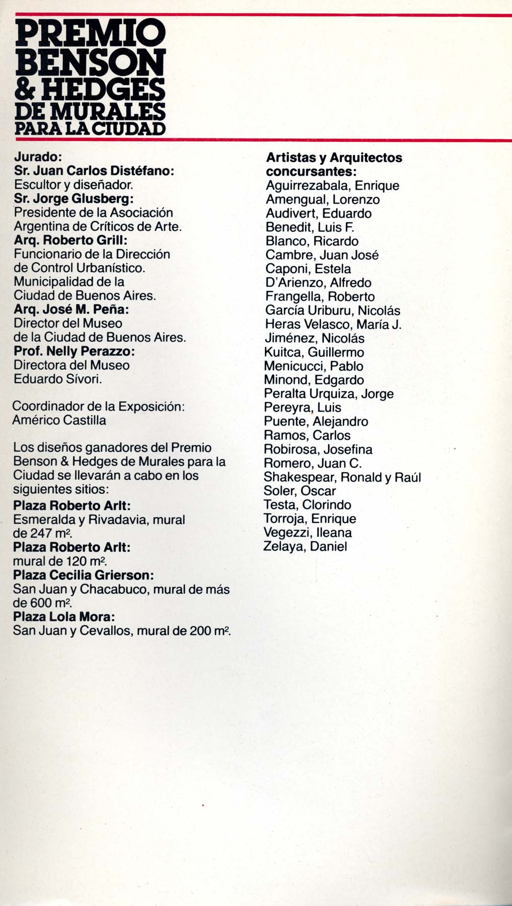 Jurado: Juan Carlos Distéfano, Jorge Glusberg, Roberto Grill, Nelly Perazzo. Artistas y arquitectos concursantes: Audivert, Benedit, Kemble, Kuitka,Shakespear, Testa, entre otros. Coordinador Américo Castilla.