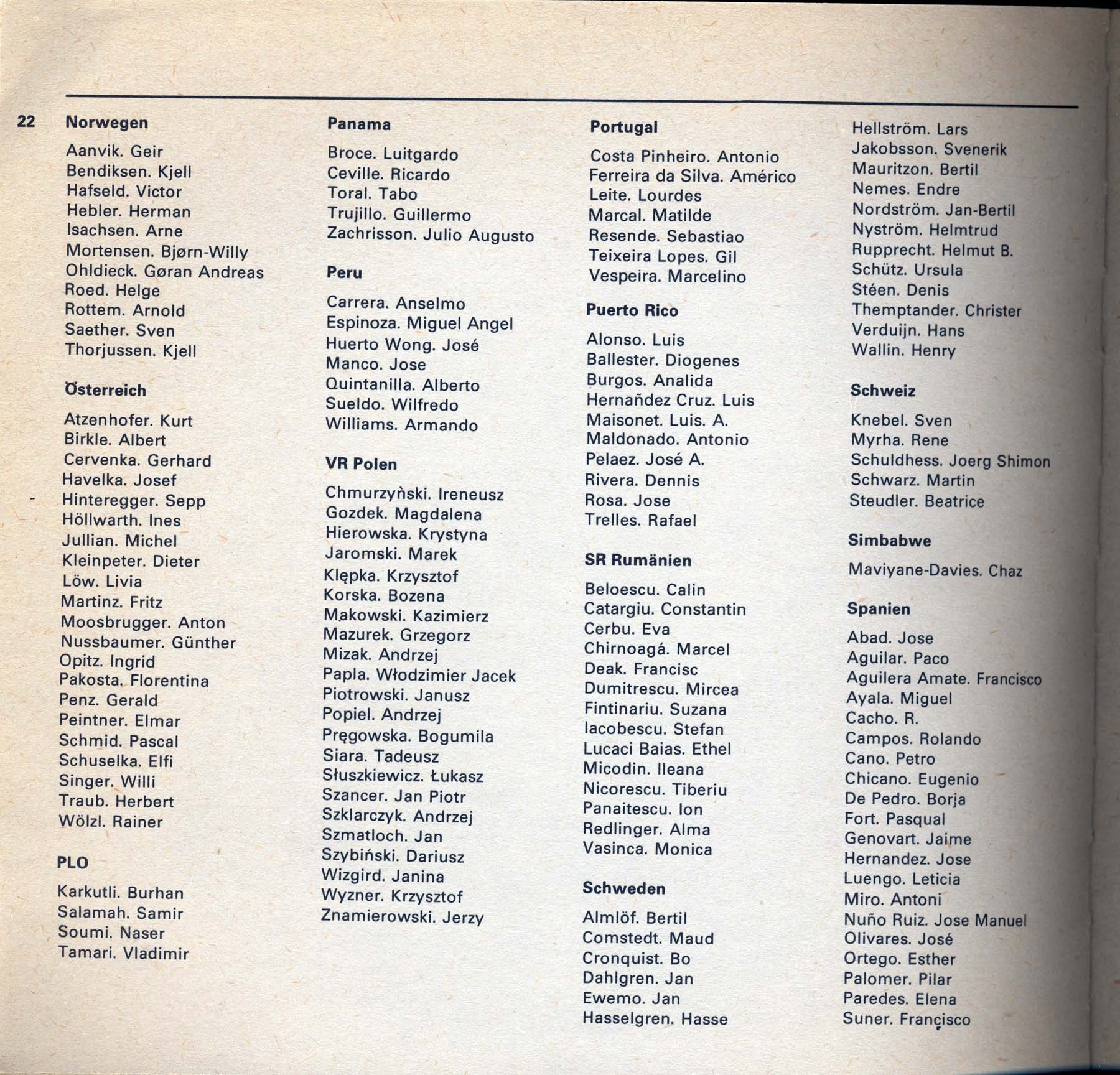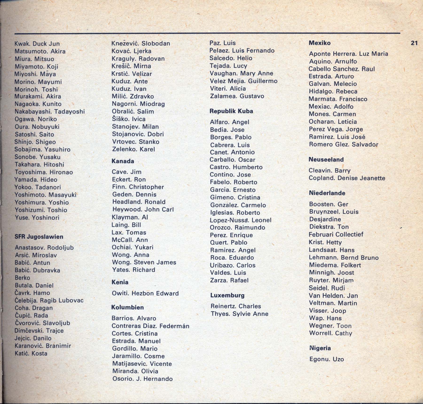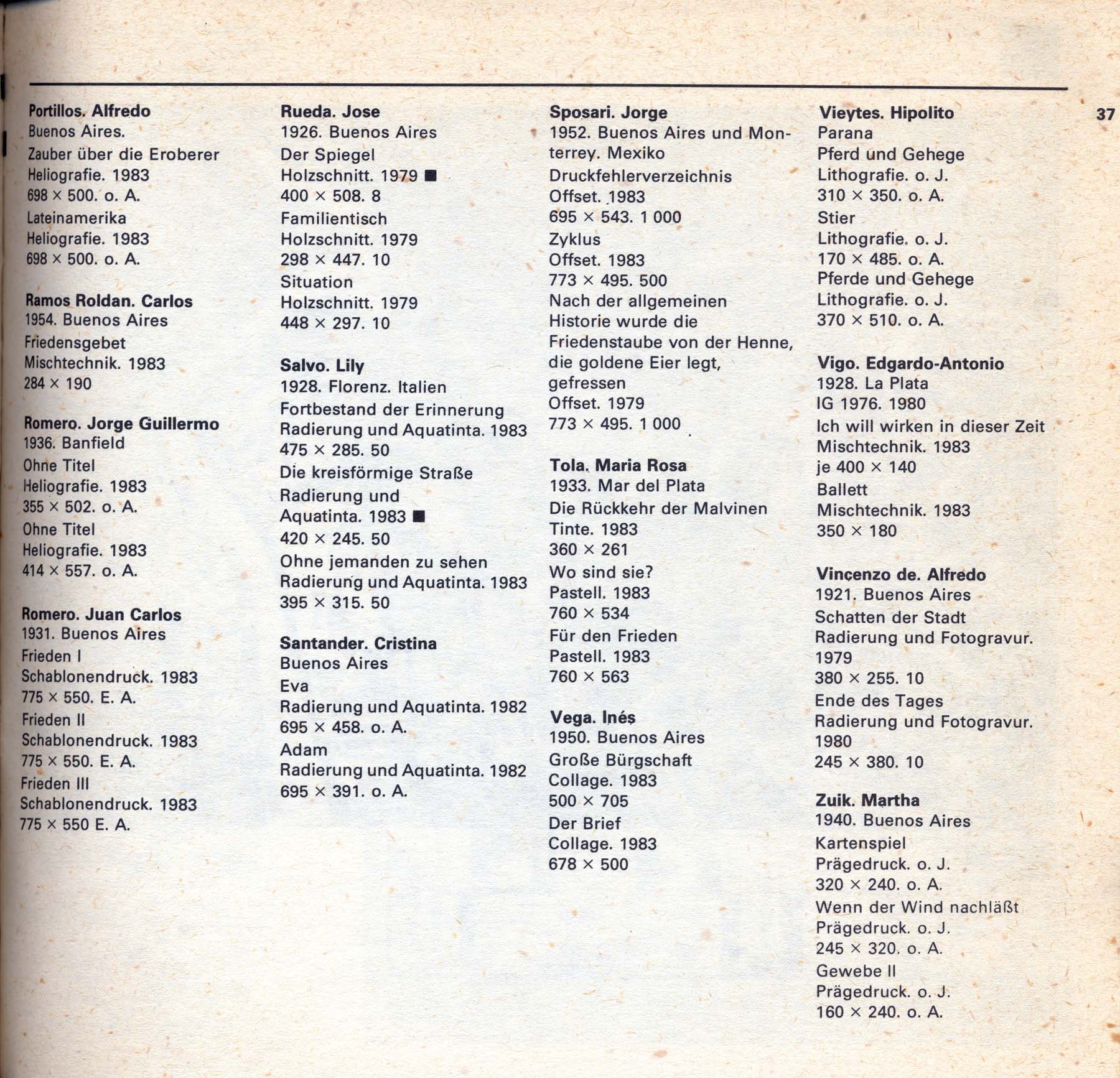 Juan Carlos Romero Participa con "Frieden I" (1983), Frieden II (1983) y Frieden III (1983) []Participan, entre otros: Nawar, Ketesela, Koraichi, Jorge Gumbe, Teixeira, Agatiello, Alisio, Benavidez, Benitez, Benjuya, Bobbio, Brambilla, Brandolni, Briuolo, Cartassio, Curcio, D'Avola, Fridman, Galeta, Grassi, Gutiérrez Marx, Herrero, Hoff, Iniesta, Jannelo, Jozami, Kuitca, Medici, Melcon, Micheleti, Monzo, Pachecho, Padawer, Paz, Perez, Pesce, Ponce, Portillos, Rueda, Santander, Tola, Vega, Vigo, Zuik, Breen, Burgess, White, Alamir, Habib, Hussan, Rakib, Satter, Barsin, Rojas, Balcarel, Beer, Bellucci, Burchard, Camargo, Couto, Fernandes, Gomez de Oliveira, Moura, Roth, Dimow, Janew, Miltrani, Akkermann, Bayrie, Berges, Broer, Coban, Cordes, Eidt, escher, Esser, Fischer, Dorch, Geilen, Goetti, Haller, Herr, Hetz, Janke, Knopp, Nolte, Ober, Palm, Ptersen, Richter, Rusch, Sartorius, Scmitz, Schröter, Spars, Staeck, Tokarz, Deisler, Dittborn, Fletcher, Moreno Robles, Pellegrin, Tapia, Tejeda, Altmann, Anderle, Holoubek, Otava, Saska, Sävel, Tropp, Andersen, Hagens, Ipsen, Jacobsen, Kruse, Lohmann, Scherfig, Stelvig, Sylvest, Ulrich, Behrendt, Dress, Giebe, Goltzche, Kozik, Lindermann, Metzkes, Mohr, Niemeyer-Holstein, Paris, Sittle, Acosta, barros, Cobo, Cueva, Iza, Lopez, Lucero, Naranjo, Sicles, Torres, Alapuro, Lund, Ollin, Riippa, Bealu, Claus, Erny, Siavoski, Simon, springer, Tedesco, Val, Agraniotis, Charo, Mela, Pandolfini, Pipinis, Ziaka, Chambers, Clark, Cockrell, Stubbs, But Tze-Yung, Leung, Lee, Banerjee, Bose, Das, Dasgupta, Lakmi, Mullick, Panesar, Pradhan, Roy, Sarkar, Sarok, Sen, Pirous, Sabana, Sunaryo, Sutanto, Al Tawil, Hakki, King, Abis, Attardi, Basaglia, BUssotti, Calabria, Caruso, Corrado, Calandri, De Vita, Farulli, Franco, Fratianni, Frazzi, Gambino, Guerricchio, Gatti, Lodi, Magnolato, Manani, Martinelli, Wolf, Zancanaro, Zarotti, Amali, Ando, Araki, Ay-O, Anastasov, Berko, Coha, Obralic, Cave, Eckert, Gedeb, Klayman, McCall, Ochial, Wong, Yates, Owiti, Barrios, Contreras, Cortes, Estrada, Jaramillo, Miranda, Osorio, Paz, Pelaez, Salcedo, Tejada, Viteri, Alfaro, Bedi, Borges, Cabrera, Canet, Carballo, GOnzalez, Lopez Nussa, Perez, Quert, Ramirez, Roca, Valdes, Owiti, Alfaro, Reinertz, Thyes, Egoni, Boosten, , Aanvik, Hebler, Karkutti, Costa, Alonso, Ballester, Burgos, Maisonet, Riveira, Rosa, Trelles, Baloescu, Cerbu, Fintinaru, Iacobescu, Micodin, Vasinca, Ewemo, Nemes, Verduijn, Knebel, Schwarz, Genovart, Hernandez, Luengo, Miro, Olivares, Suner, Hind, Nazeer, Hamid, Yeter, Czcinke, Dorosz, Lacza, Pócs, Veszely, Helmut, Kagarow, Suworow, Troschkow, Chamnitzer, Cattelani, Easton, Kohler, Obelar, Sagradini, Autry, Becker, Banerjee, Cantor, Capobianco, Carter, Davis, Fletcher, Roth, Scholder, Stewart, Tecla, Toney, Wallace, Bess, Chachon, Dembo, Becker, Gorella, Koeppel, Niess, Schuarz, Nzazi, Loizos,