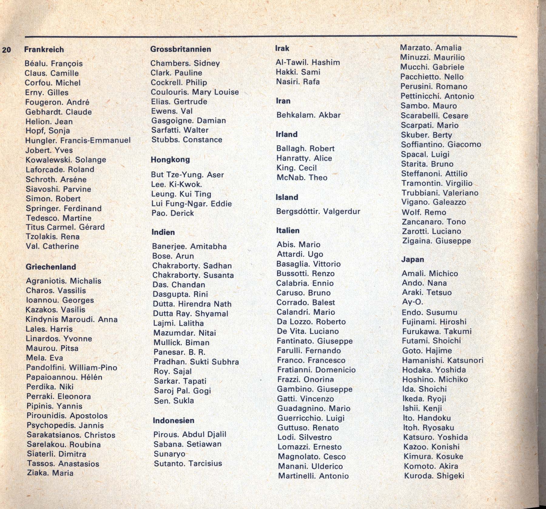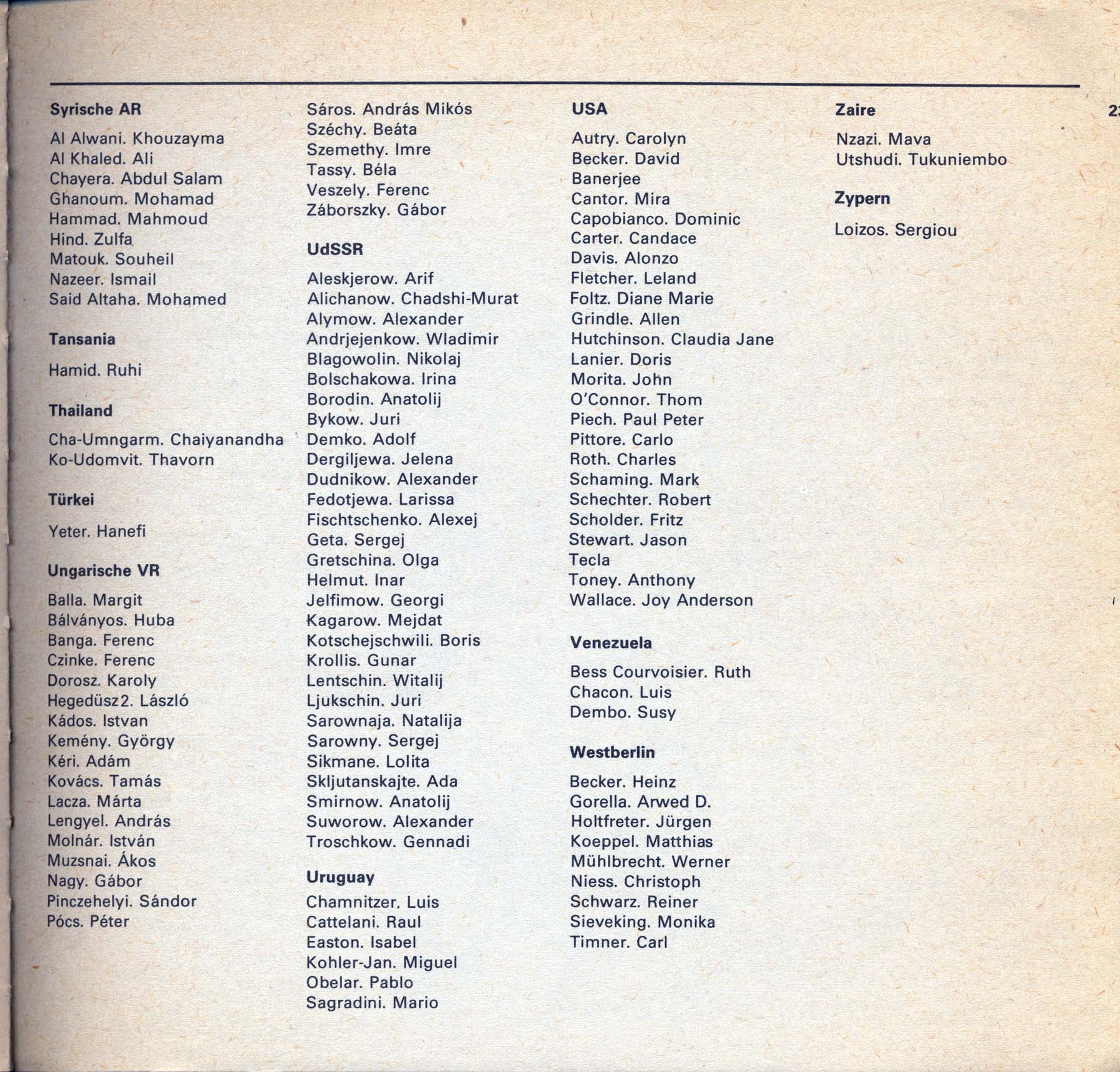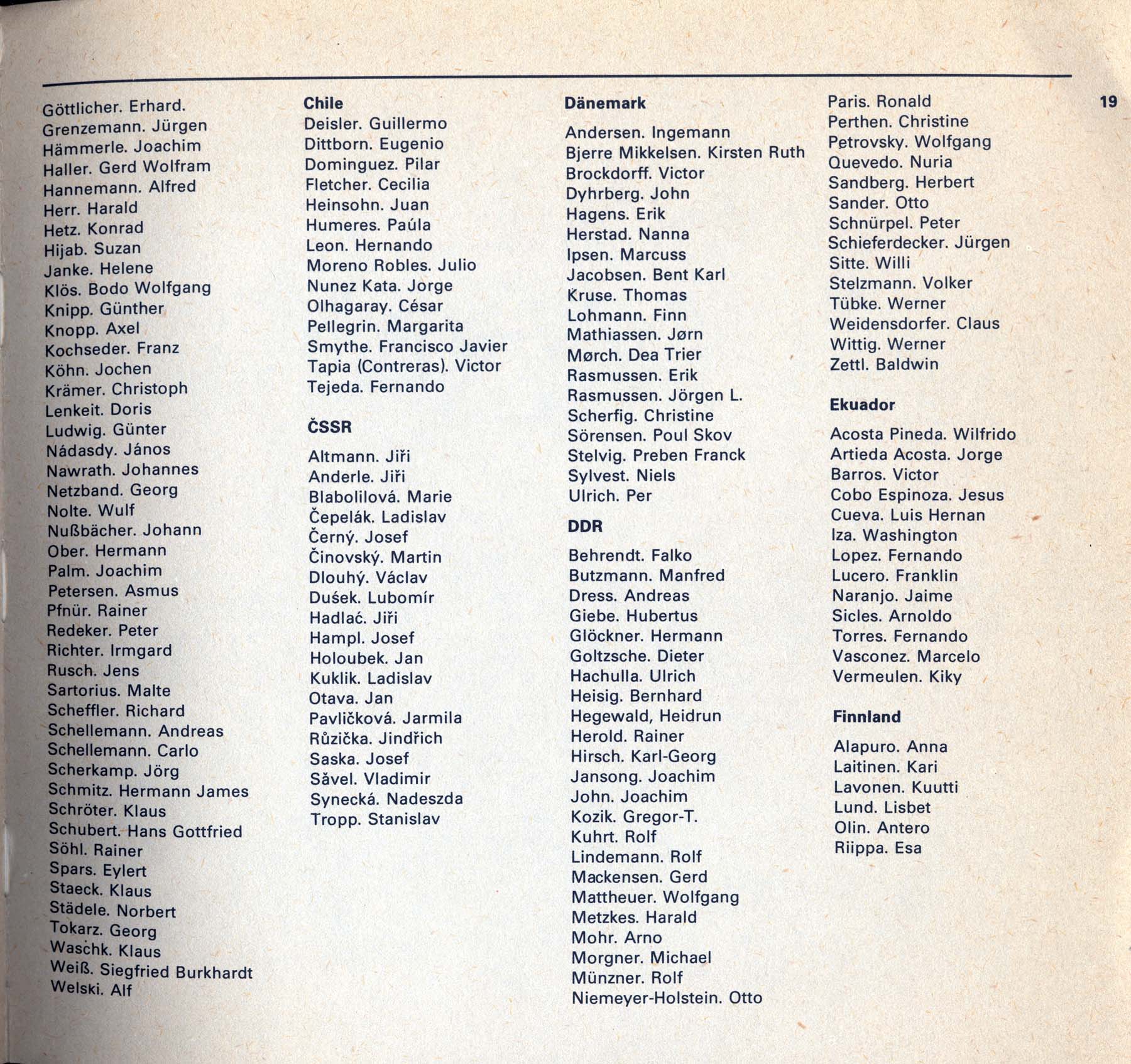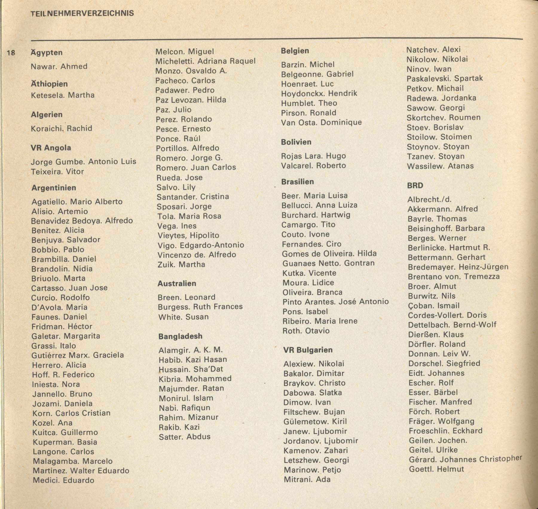 Juan Carlos Romero Participa con "Frieden I" (1983), Frieden II (1983) y Frieden III (1983) []Participan, entre otros: Nawar, Ketesela, Koraichi, Jorge Gumbe, Teixeira, Agatiello, Alisio, Benavidez, Benitez, Benjuya, Bobbio, Brambilla, Brandolni, Briuolo, Cartassio, Curcio, D'Avola, Fridman, Galeta, Grassi, Gutiérrez Marx, Herrero, Hoff, Iniesta, Jannelo, Jozami, Kuitca, Medici, Melcon, Micheleti, Monzo, Pachecho, Padawer, Paz, Perez, Pesce, Ponce, Portillos, Rueda, Santander, Tola, Vega, Vigo, Zuik, Breen, Burgess, White, Alamir, Habib, Hussan, Rakib, Satter, Barsin, Rojas, Balcarel, Beer, Bellucci, Burchard, Camargo, Couto, Fernandes, Gomez de Oliveira, Moura, Roth, Dimow, Janew, Miltrani, Akkermann, Bayrie, Berges, Broer, Coban, Cordes, Eidt, escher, Esser, Fischer, Dorch, Geilen, Goetti, Haller, Herr, Hetz, Janke, Knopp, Nolte, Ober, Palm, Ptersen, Richter, Rusch, Sartorius, Scmitz, Schröter, Spars, Staeck, Tokarz, Deisler, Dittborn, Fletcher, Moreno Robles, Pellegrin, Tapia, Tejeda, Altmann, Anderle, Holoubek, Otava, Saska, Sävel, Tropp, Andersen, Hagens, Ipsen, Jacobsen, Kruse, Lohmann, Scherfig, Stelvig, Sylvest, Ulrich, Behrendt, Dress, Giebe, Goltzche, Kozik, Lindermann, Metzkes, Mohr, Niemeyer-Holstein, Paris, Sittle, Acosta, barros, Cobo, Cueva, Iza, Lopez, Lucero, Naranjo, Sicles, Torres, Alapuro, Lund, Ollin, Riippa, Bealu, Claus, Erny, Siavoski, Simon, springer, Tedesco, Val, Agraniotis, Charo, Mela, Pandolfini, Pipinis, Ziaka, Chambers, Clark, Cockrell, Stubbs, But Tze-Yung, Leung, Lee, Banerjee, Bose, Das, Dasgupta, Lakmi, Mullick, Panesar, Pradhan, Roy, Sarkar, Sarok, Sen, Pirous, Sabana, Sunaryo, Sutanto, Al Tawil, Hakki, King, Abis, Attardi, Basaglia, BUssotti, Calabria, Caruso, Corrado, Calandri, De Vita, Farulli, Franco, Fratianni, Frazzi, Gambino, Guerricchio, Gatti, Lodi, Magnolato, Manani, Martinelli, Wolf, Zancanaro, Zarotti, Amali, Ando, Araki, Ay-O, Anastasov, Berko, Coha, Obralic, Cave, Eckert, Gedeb, Klayman, McCall, Ochial, Wong, Yates, Owiti, Barrios, Contreras, Cortes, Estrada, Jaramillo, Miranda, Osorio, Paz, Pelaez, Salcedo, Tejada, Viteri, Alfaro, Bedi, Borges, Cabrera, Canet, Carballo, GOnzalez, Lopez Nussa, Perez, Quert, Ramirez, Roca, Valdes, Owiti, Alfaro, Reinertz, Thyes, Egoni, Boosten, , Aanvik, Hebler, Karkutti, Costa, Alonso, Ballester, Burgos, Maisonet, Riveira, Rosa, Trelles, Baloescu, Cerbu, Fintinaru, Iacobescu, Micodin, Vasinca, Ewemo, Nemes, Verduijn, Knebel, Schwarz, Genovart, Hernandez, Luengo, Miro, Olivares, Suner, Hind, Nazeer, Hamid, Yeter, Czcinke, Dorosz, Lacza, Pócs, Veszely, Helmut, Kagarow, Suworow, Troschkow, Chamnitzer, Cattelani, Easton, Kohler, Obelar, Sagradini, Autry, Becker, Banerjee, Cantor, Capobianco, Carter, Davis, Fletcher, Roth, Scholder, Stewart, Tecla, Toney, Wallace, Bess, Chachon, Dembo, Becker, Gorella, Koeppel, Niess, Schuarz, Nzazi, Loizos,