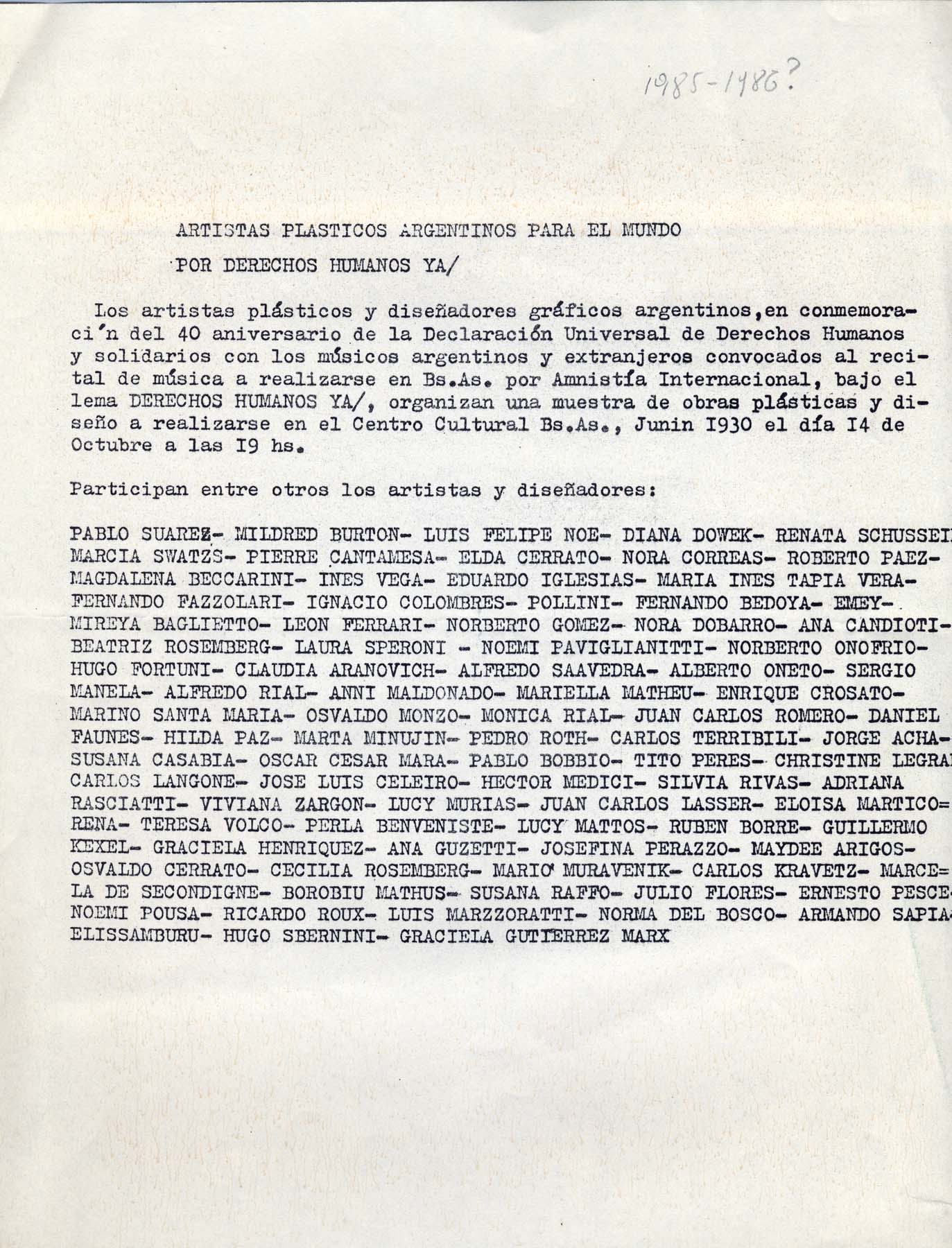 Documento escrito a máquina de escribir. En conmemoración del 40 aniversario de la Declaración Universal de los DDHH, En el marco del recital de música organizado por Amnistía internacional, organizan muestra de obras plásticas y diseño. Centro Cultural Buenos Aires. Participan: Pablo Suarez, Midred Burton, Noé, Dowek, Schussem, Schwartz, Elda Cerrato, Eduardo Iglesias, Bedoya, León Ferrari, Hilda Paz, Marta Minujin, Jorge Acha, Guillermo Kexel, entre otros. Nota: Inscripción en lápiz: "1985-1986?"