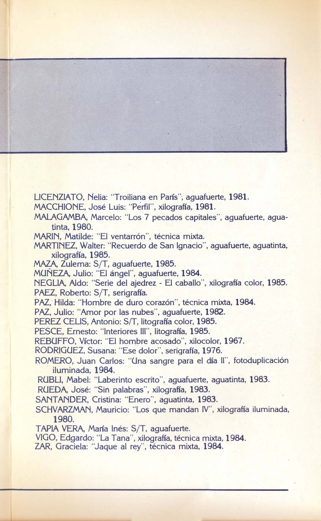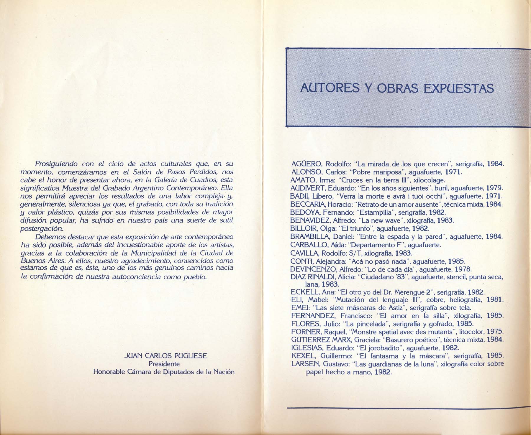Texto de Juan Carlos Pugliese. Participan: Agüero, Alonso, Amato, Audivert, Beccaría, Bedoya, Benavidez, Billoir, Eckel, Forner, Gutiérrez Marx, Larsen, Pérez Celis, Santander, Vigo. "Una sangre para el día II"