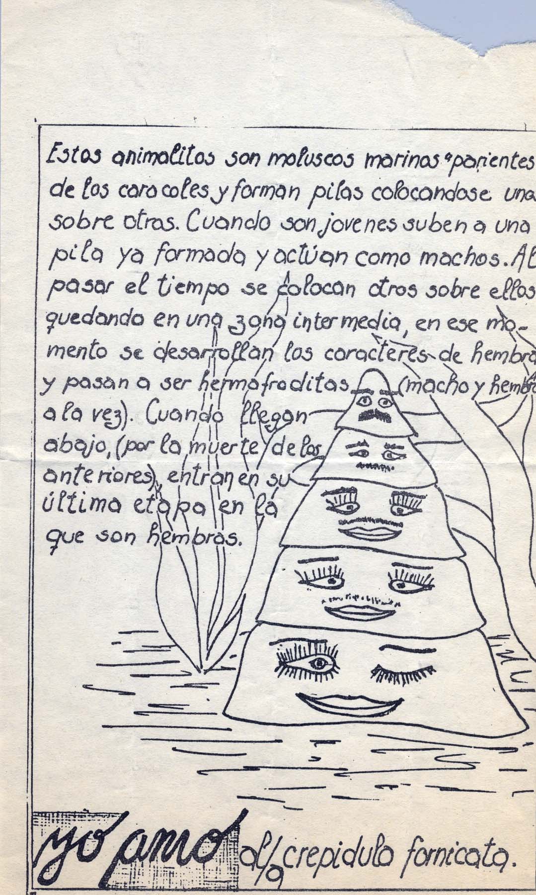 Documento donde se reproduce una ilustración y descripción. "Yo amo al crepidula fornicata". Autoría desconocida.