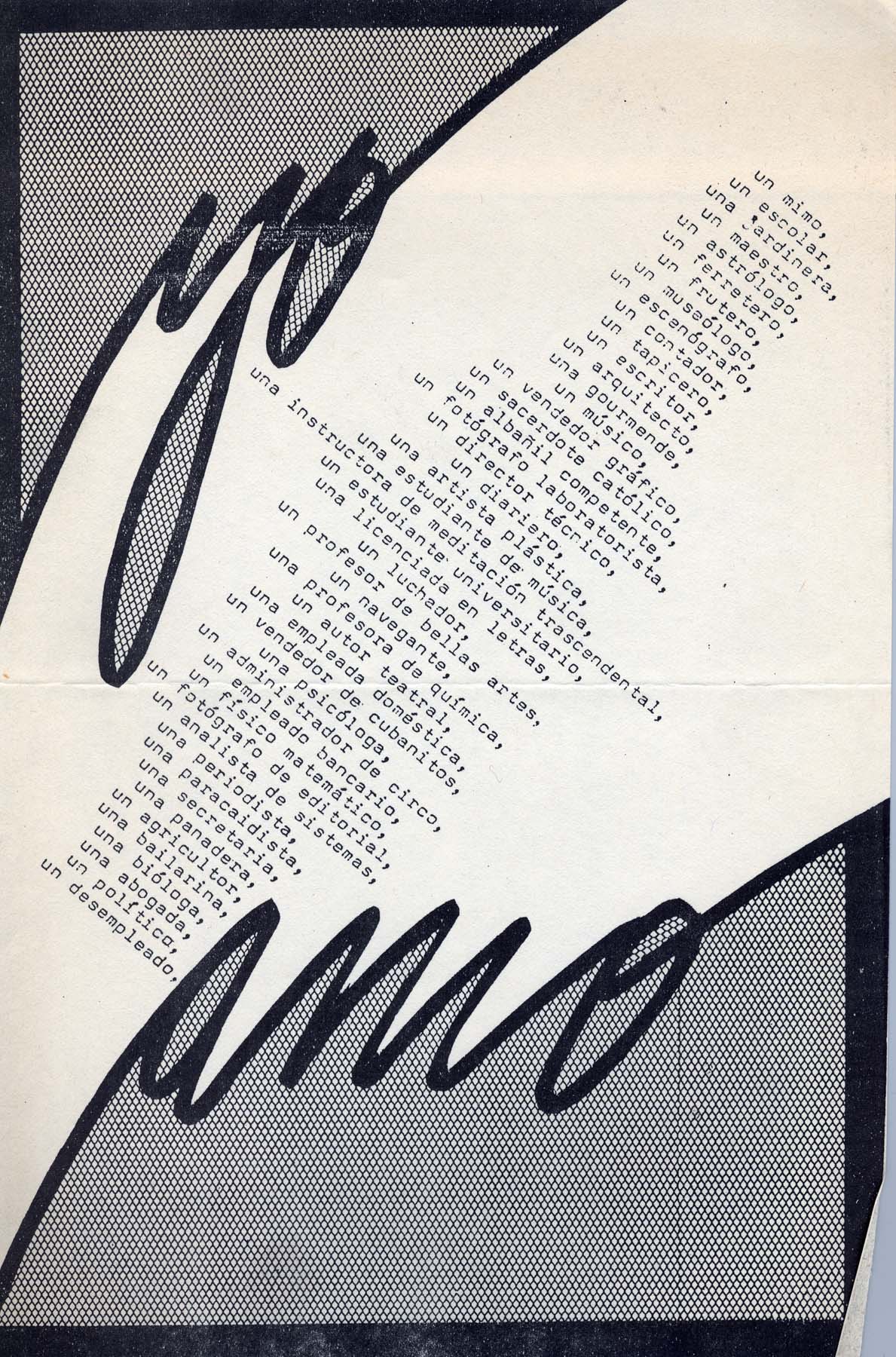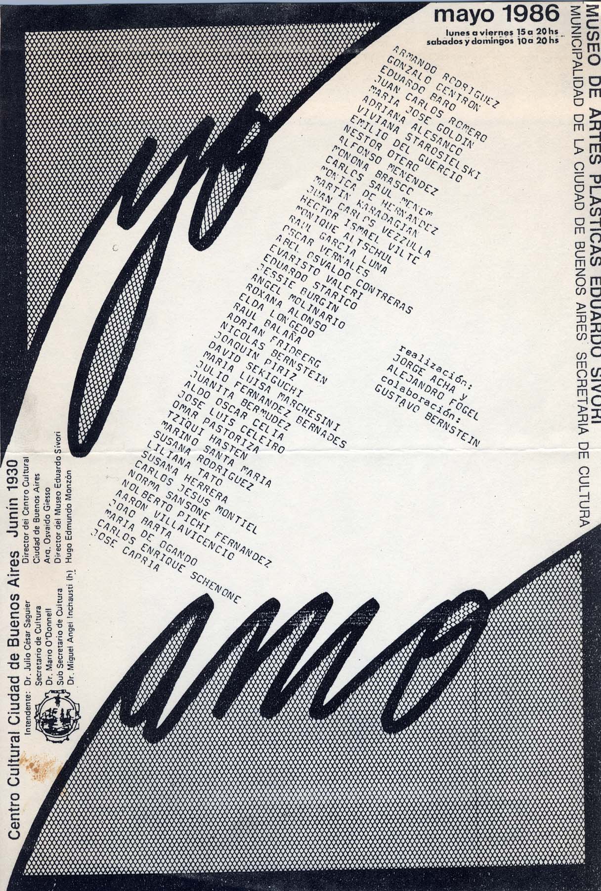 Folleto invitación. Firman: Rodriguez, Centrón, Baros, Goldin, Alesanco, Starosielski, Del Guercio, Otero, Menendez, Brasco, Menem, Hernandez, Karadagian, Vezzulla, Vilte, Altschul, García Luna, Vernales, Contreras, Valeri, Starico, Burgin, Molinario, Alonso, Longedo, Balaña, Fridberg, Bernstein, Piriz, Sekiguchi, Marchesini, Bernadez, Bermúdez, Celia, Celeiro, Pastoriza, Hasten, Santa María, Rodriguez, Tato, herrera, Montiel, Sansone, Fernandez, Villavicencio, Barta, Ogando, Schenone, Capria, . Realización: Jorge Acha, Alejandro Fogel. Colaboración: Gustavo Bernstein.