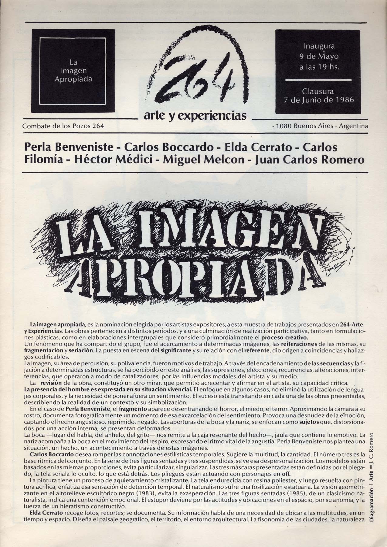 Firman: Perla Benveniste, Carlos Boccardo, Elda Cerrato, Carlos Filomía, Héctor Médici, Miguel Melcon. Texto de Rosa Faccaro, imágenes de obras de los artistas, la imagen apropiada