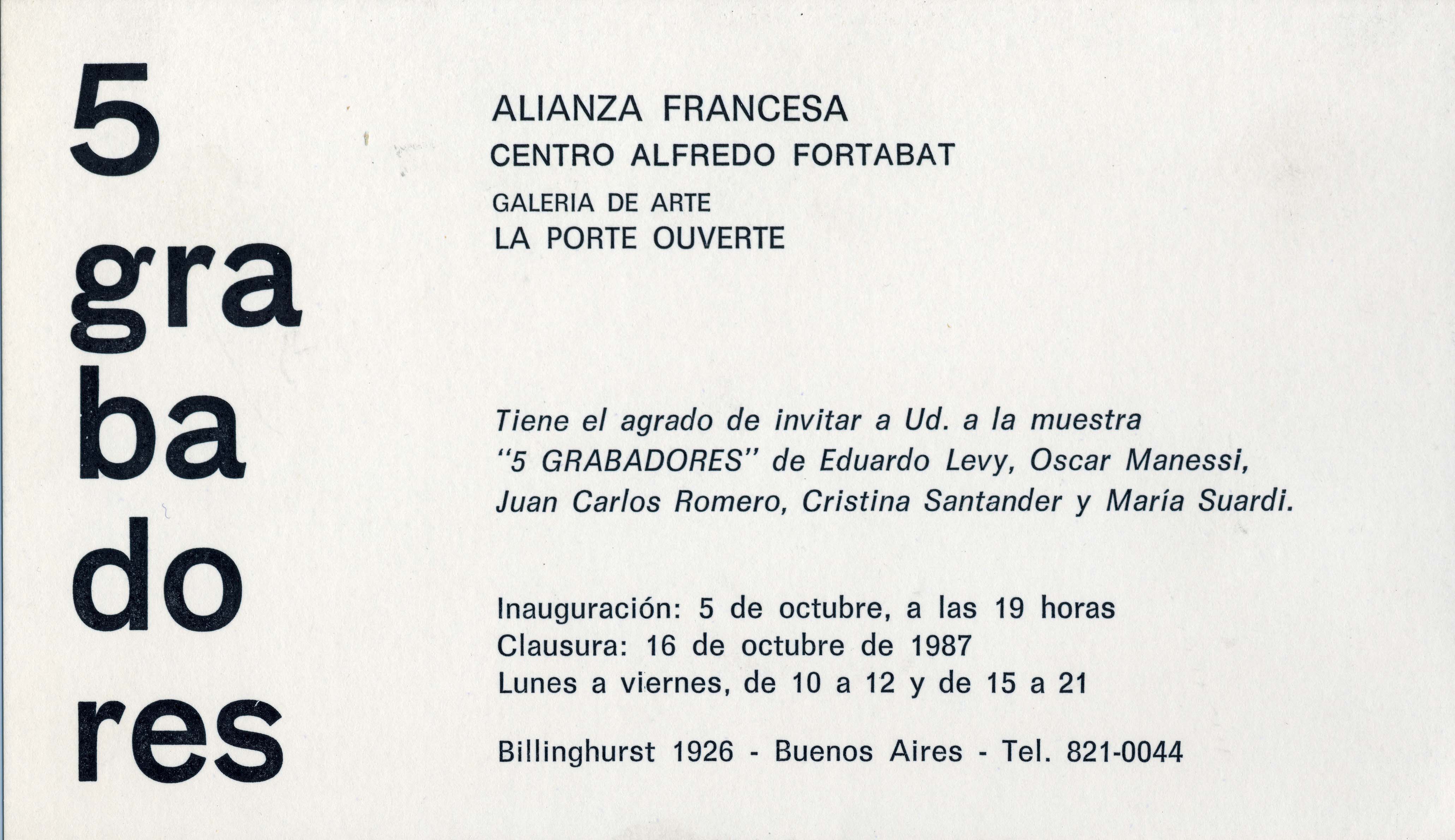 Invitación a exposición 5/10/1987. Alianza Francesa. Centro Alfredo Fortabat. Galería La Porte Ouverte