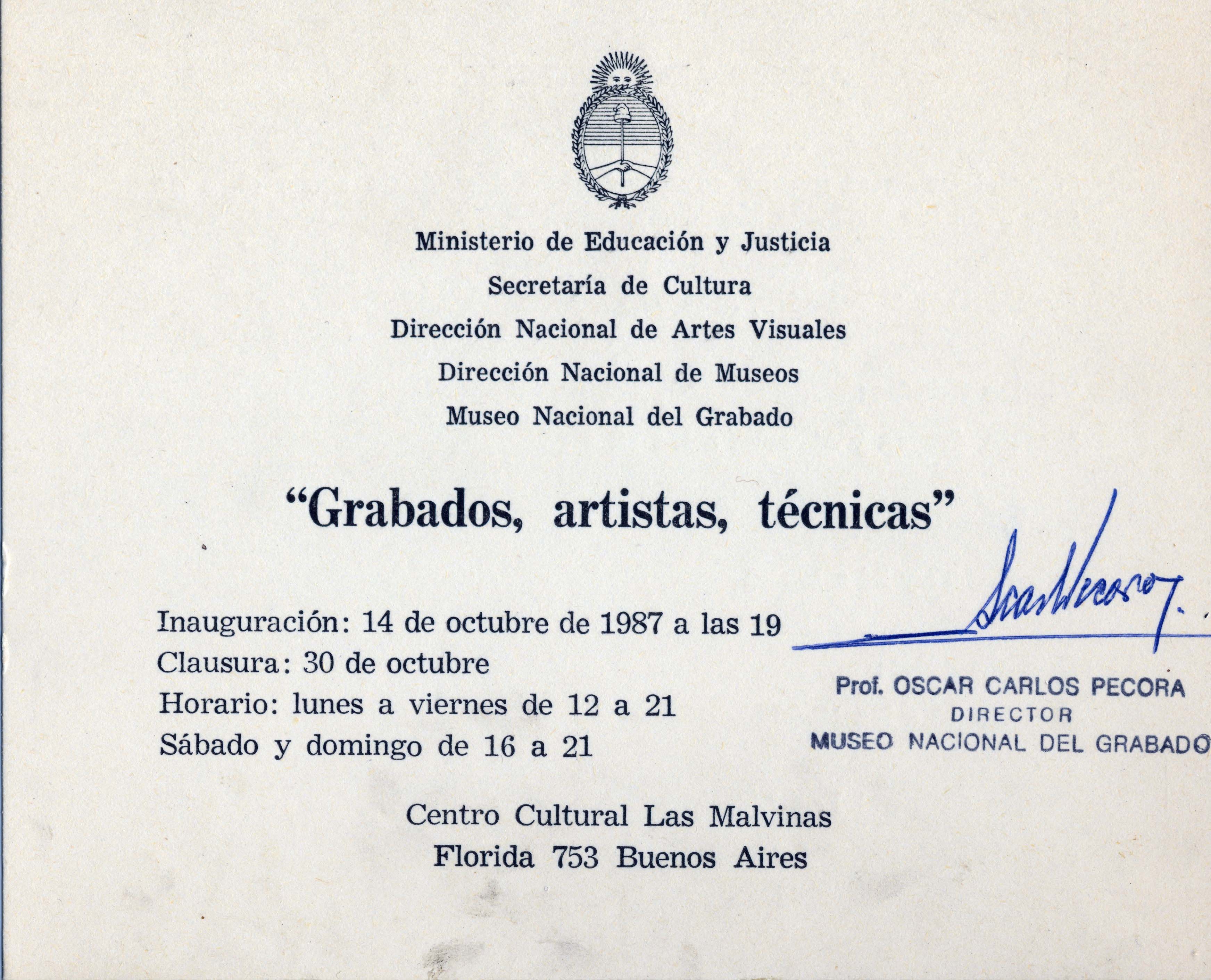 Invitación a la exposiciónParticipan: Arato, Audivert, Balan, Bellocq, Carballo, Delhez, Facio, Filevich, Guido, Lopez Anaya, Rebuffo, Seoane, Sergi, Vigo, Aberastuy, Agüero, Amato, Audivert, Benavidez, Bedoya, Cugat, De Jesus, De pilla, De Vincenzo, Echegaray, Fernandez, Ferrari, Jannello, Levy, Luna Ercilla, Macchione, Manesi, Marin, Massoneau, Matto, Mazza, Onofrio, Paz, Pesce, Pérez Temperley, Pintos, Reisner, Revythis, Ripoll, Rossi, Rueda, Rueli, Santander, Saunier, Sacannapieco, Scavino, Sierburguer, Teti, Vazquez, Versacci, Weiss, Zar, Zaraquiegui