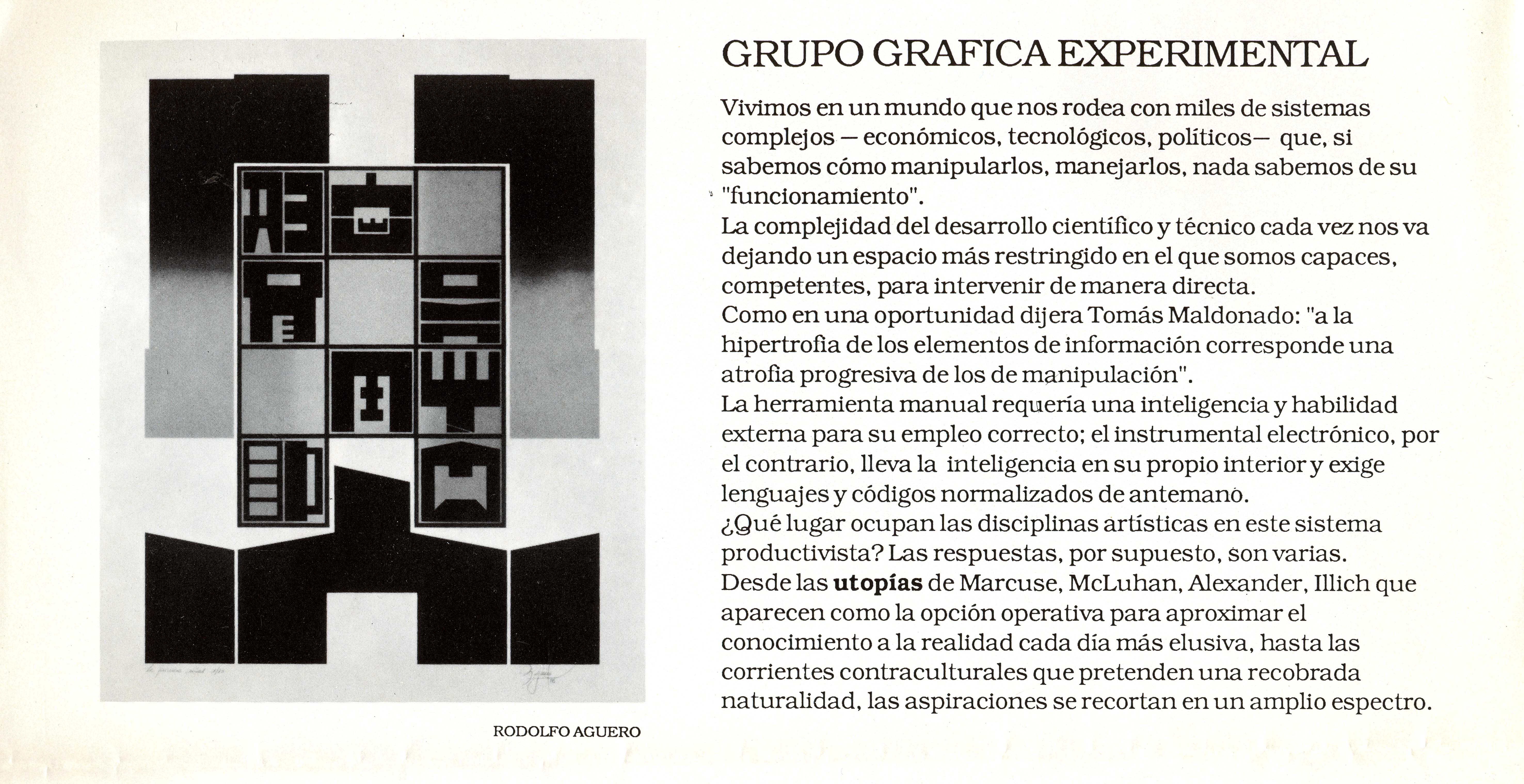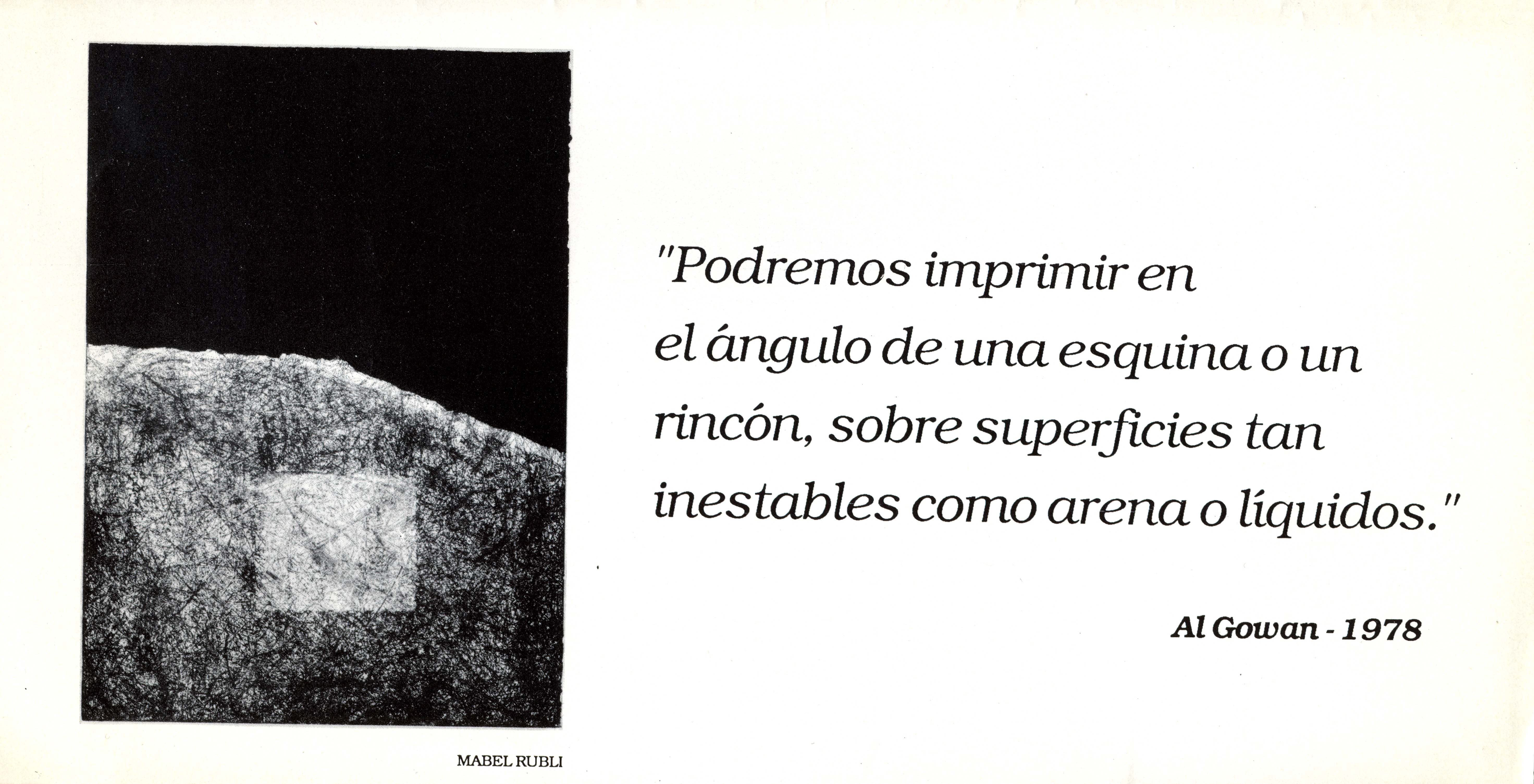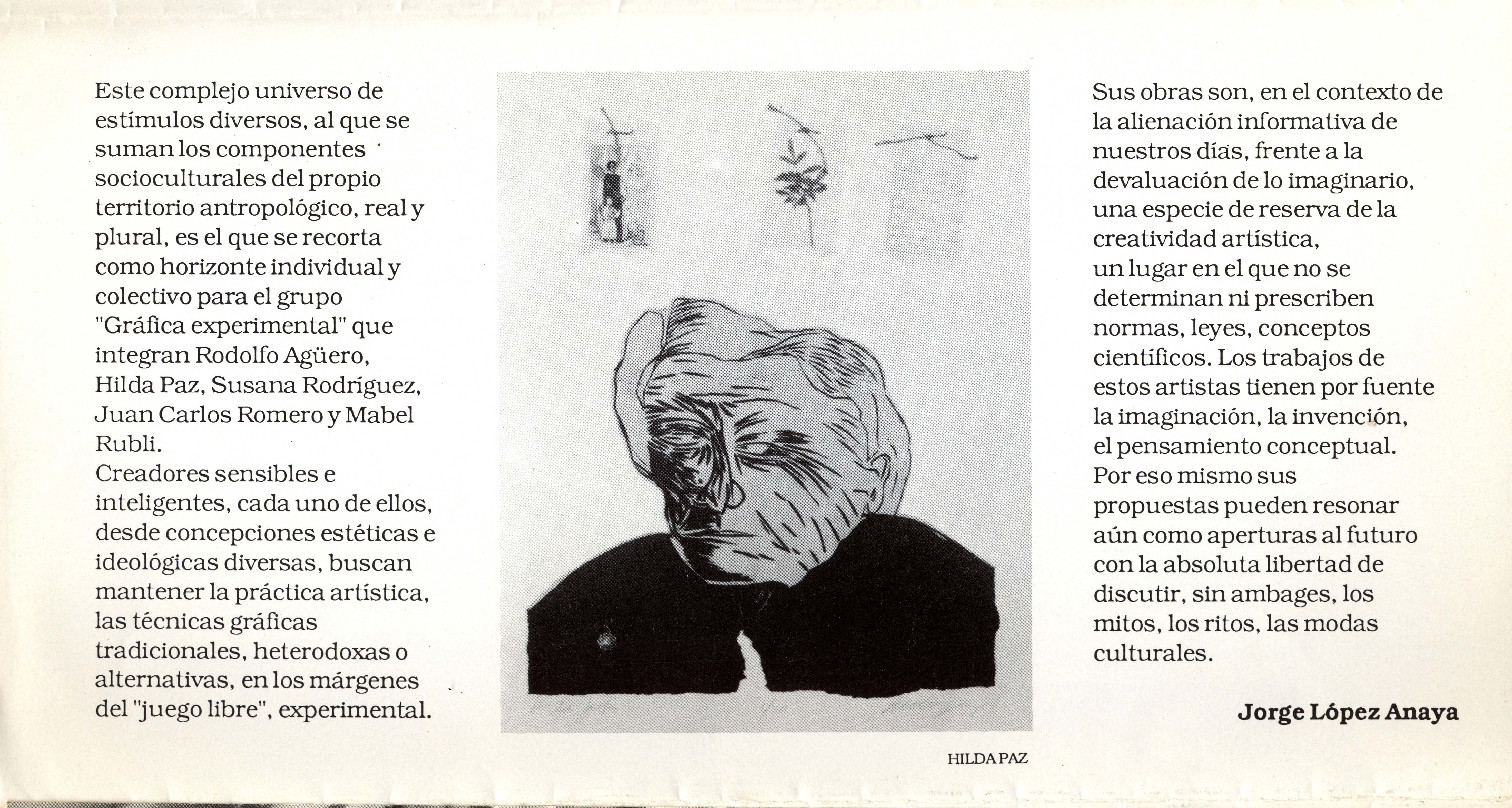 Exponen: Agüero, Paz, Rodríguez, Rubli, Romero. Texto del Grupo Gráfica Experimental, de Jorge López Anaya, frase de Al Gowan,