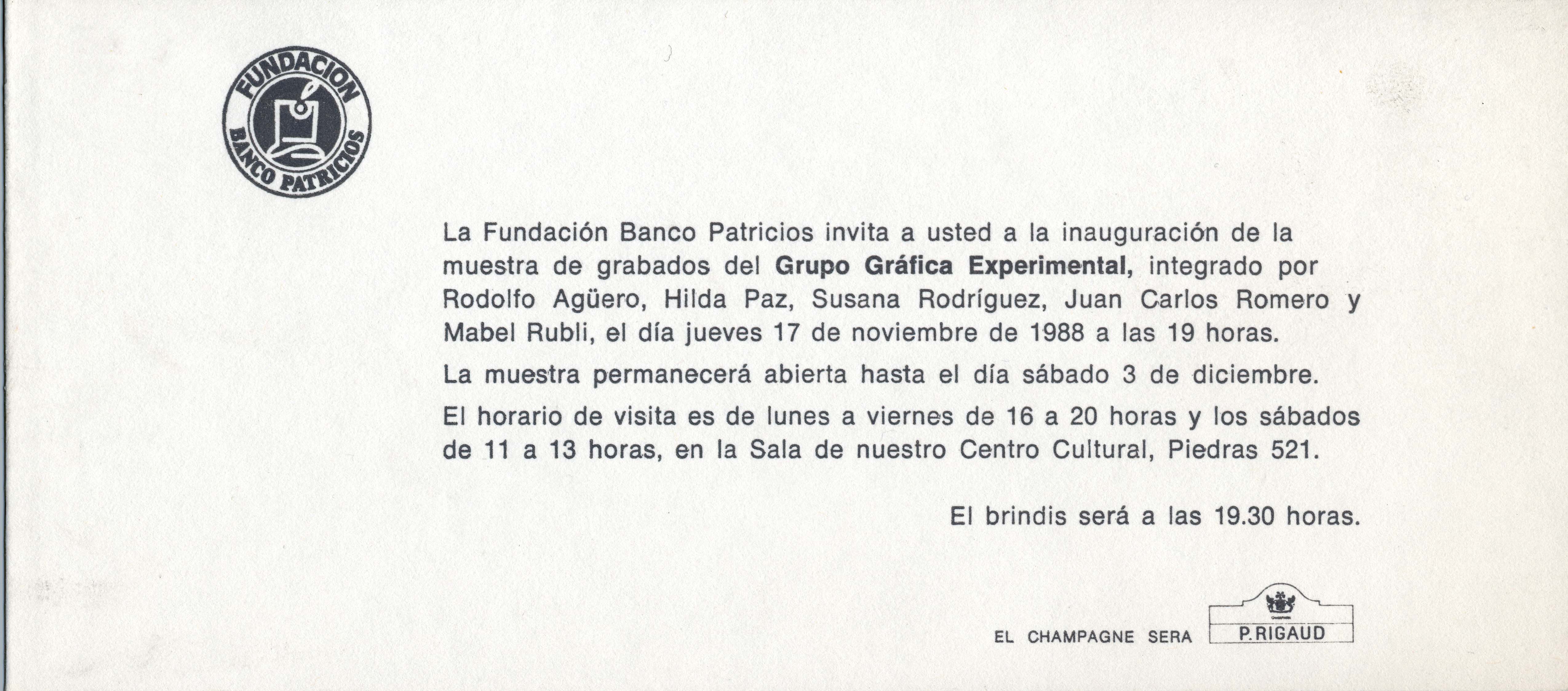 Exponen: Agüero, Paz, Rodríguez, Rubli, Romero. Texto del Grupo Gráfica Experimental, de Jorge López Anaya, frase de Al Gowan,