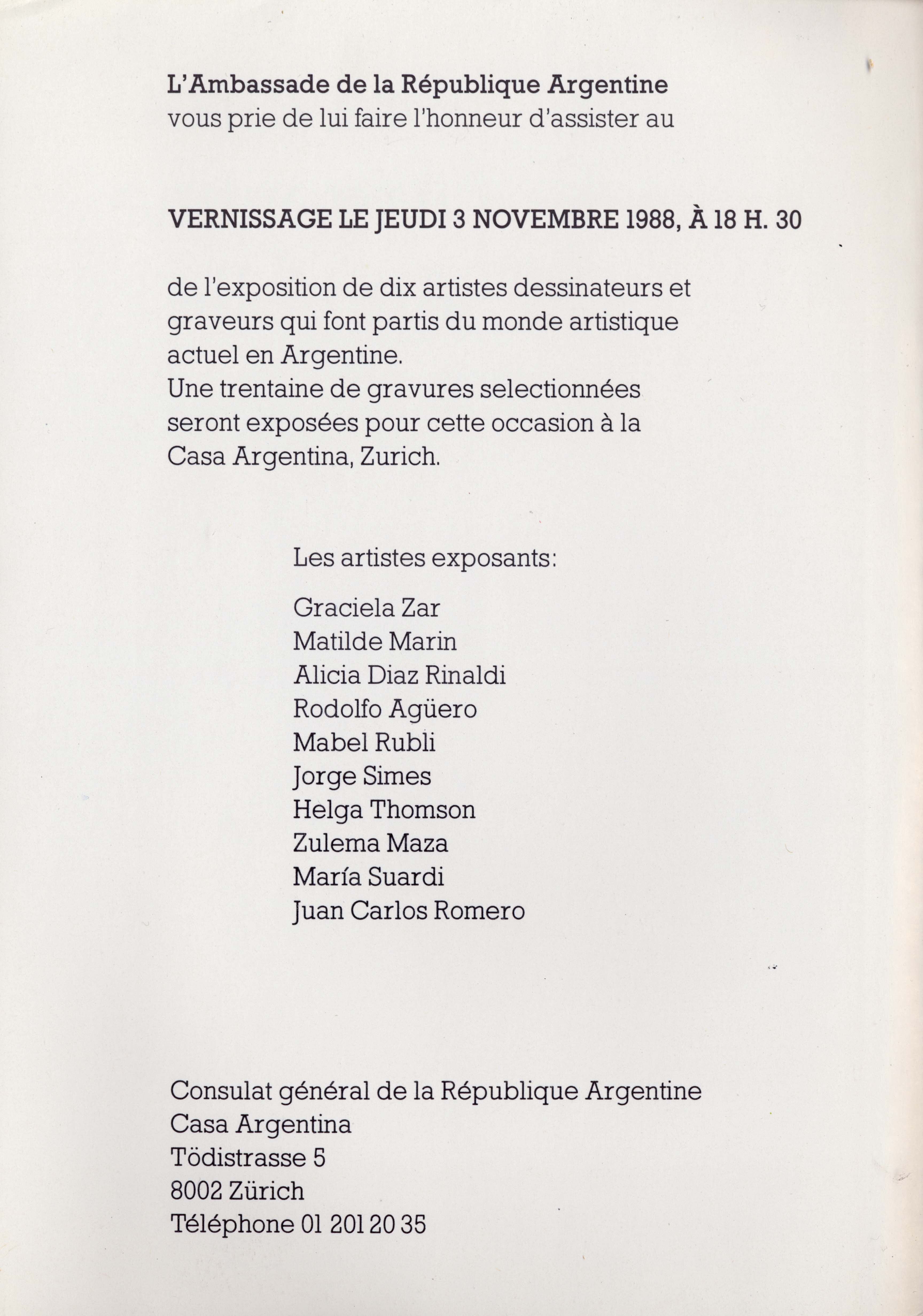 Exponen: Graciela Zar, Matilde Marín, Alicia Díaz Rinaldi, Rodolfo Agüero, Mabel Rubli, Jorge Simes, Helga Thomson, Zulema Maza, María Suardi, Juan Carlos Romero