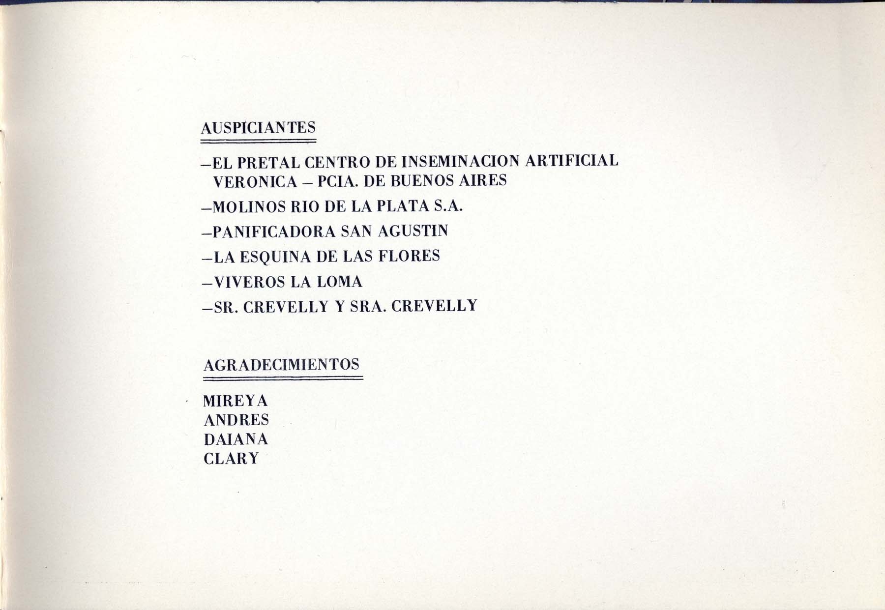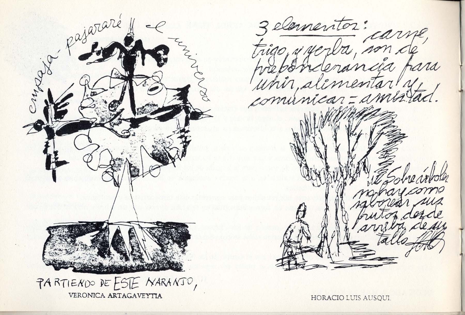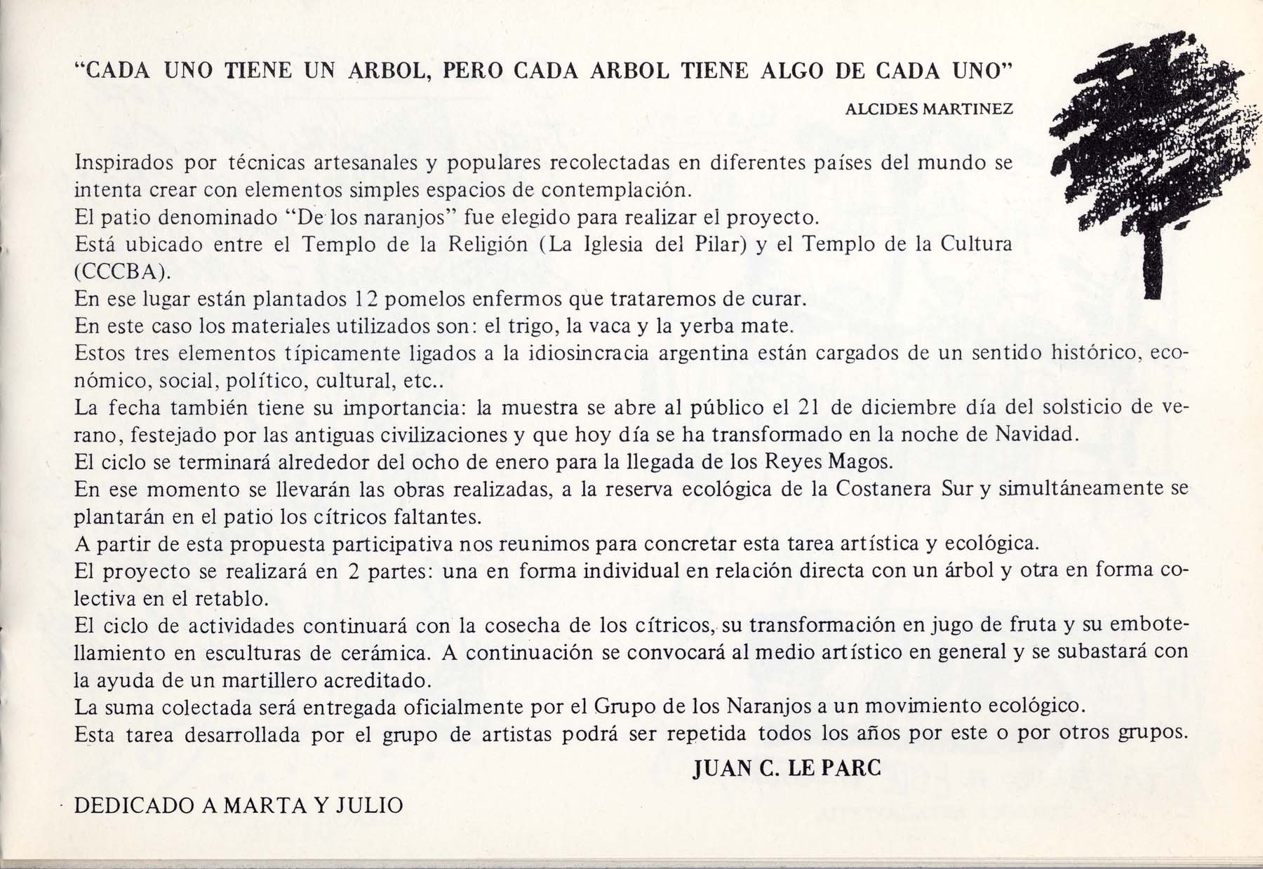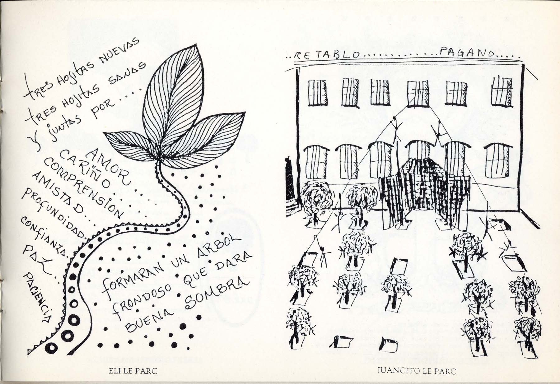 Una propuesta participativa de Juancito Le Parc. Exponen: Juancito Le Parc, Eli Le Parc, Perla Benveniste, Horacio Luis Ausqui, Teresa Volco, Ruben Grau, Adriana Barassi, Alcides Martínes Portillo, María Silvana Bevacqua, Juan Carlos Romero, Alberto Ortu Martin, Carlos Oyarzabal, Verónica Artagaveyta . Dedicado a Julio y Marta. Incluye dibujos de los /las artistas.