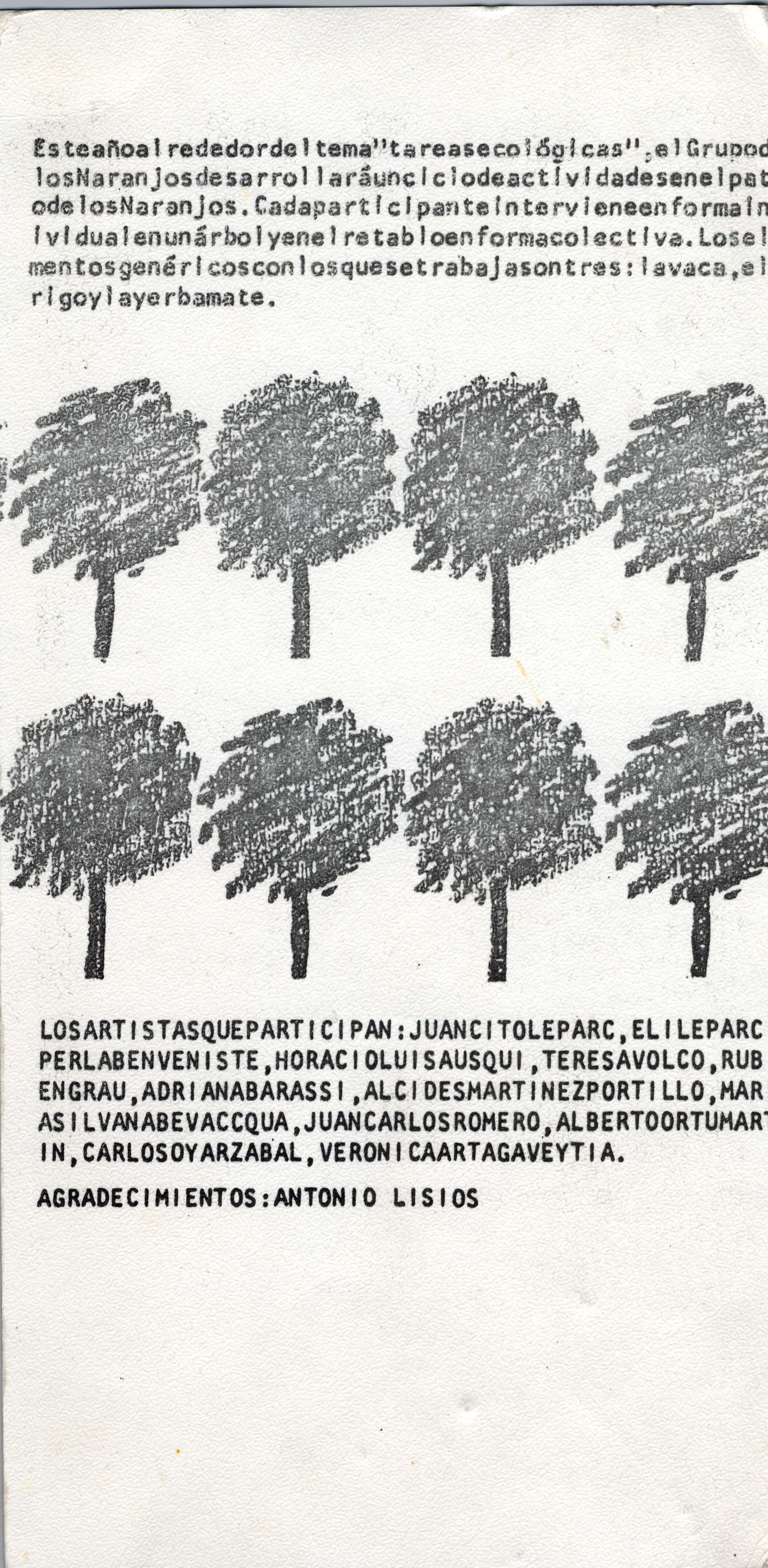 Folleto más pequeño mecanografiado. Exponen: Juancito Le Parc, Eli Le Parc, Perla Benveniste, Horacio Luis Ausqui, Teresa Volco, Ruben Grau, Adriana Barassi, Alcides Martínes Portillo, María Silvana Bevacqua, Juan Carlos Romero, Alberto Ortu Martin, Carlos Oyarzabal, Verónica Artagaveyta . Dedicado a Julio y Marta. Incluye dibujos de los /las artistas.