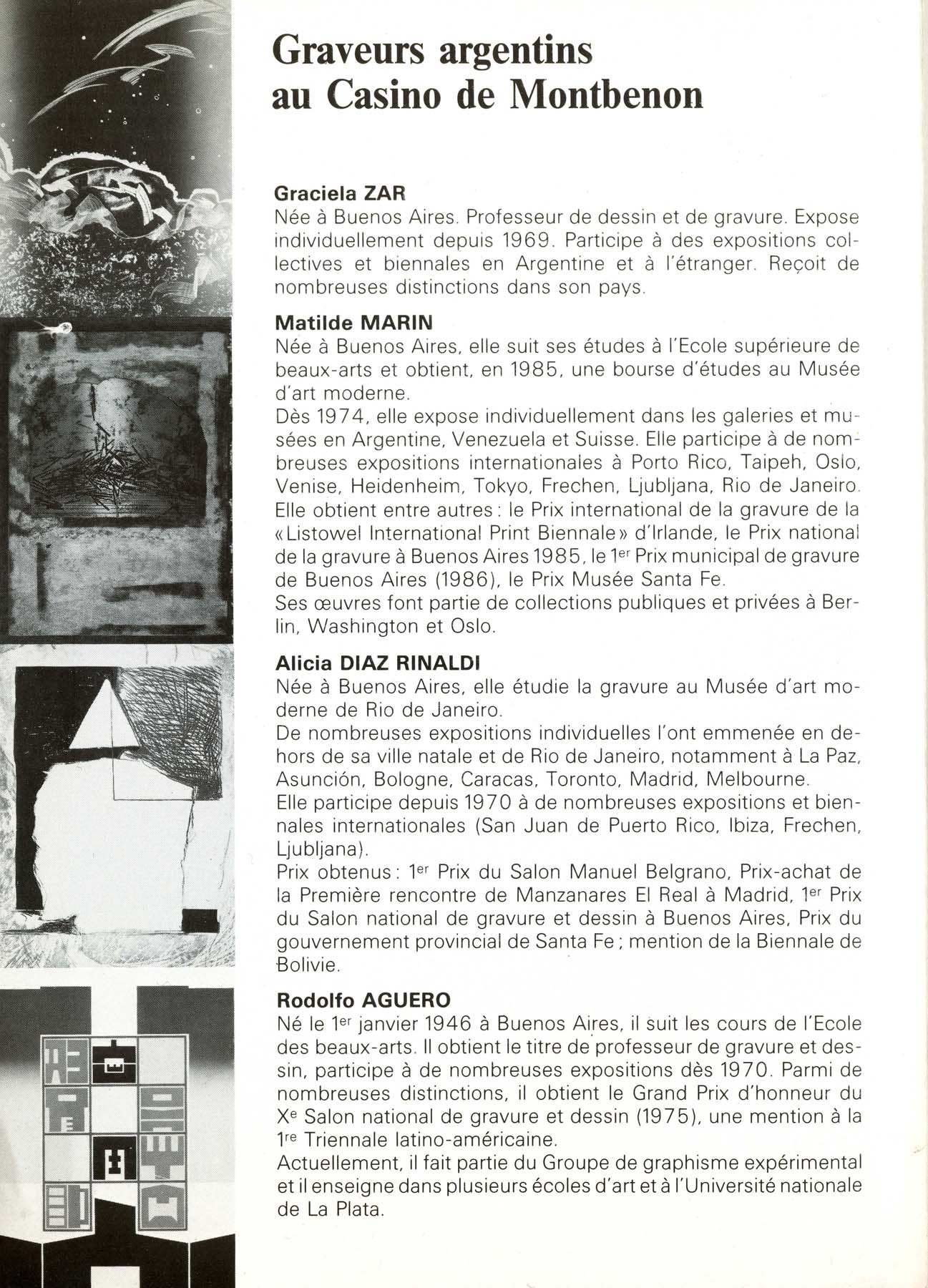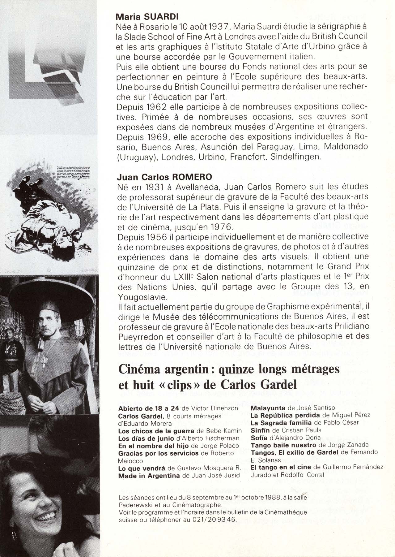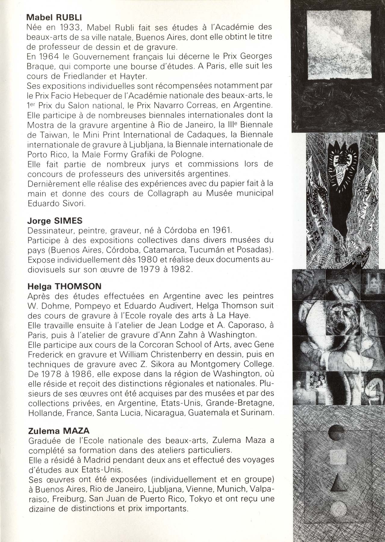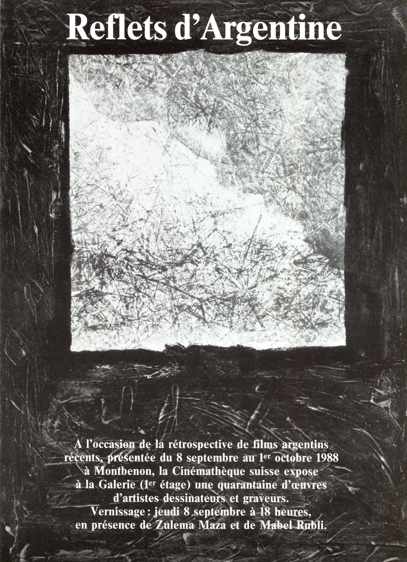 Exposición de grabados argentinos de Zar, Marin, Rinaldi, Agüero, Rubli, Simes, Thomson, Maza, Suardi, Romero. Proyección de películas de; Eduardo Morera, Bebe Kamin, Fischerman, Polaco, Maiocco, Mosquera, Jusid, Santiso, Pérez, Cesar, Pauls, Doria, Zanada, Solanas, Jurado, Corral. Zulema Maza, Mabel Rubli estuvieron en el vernissage.