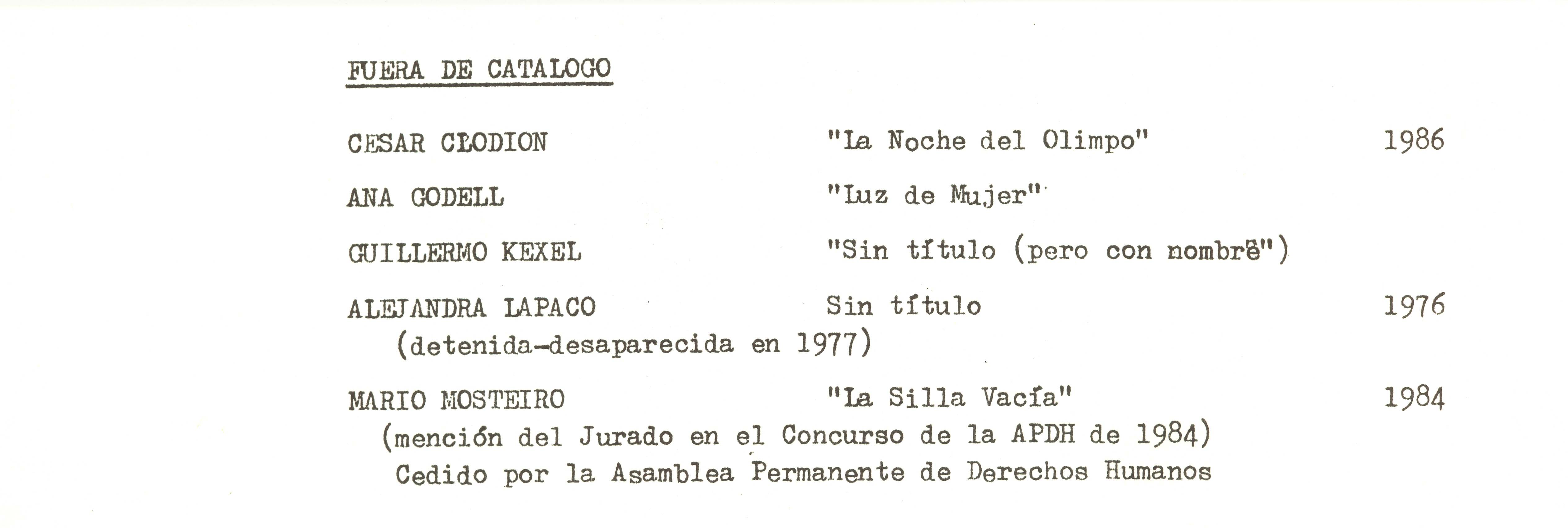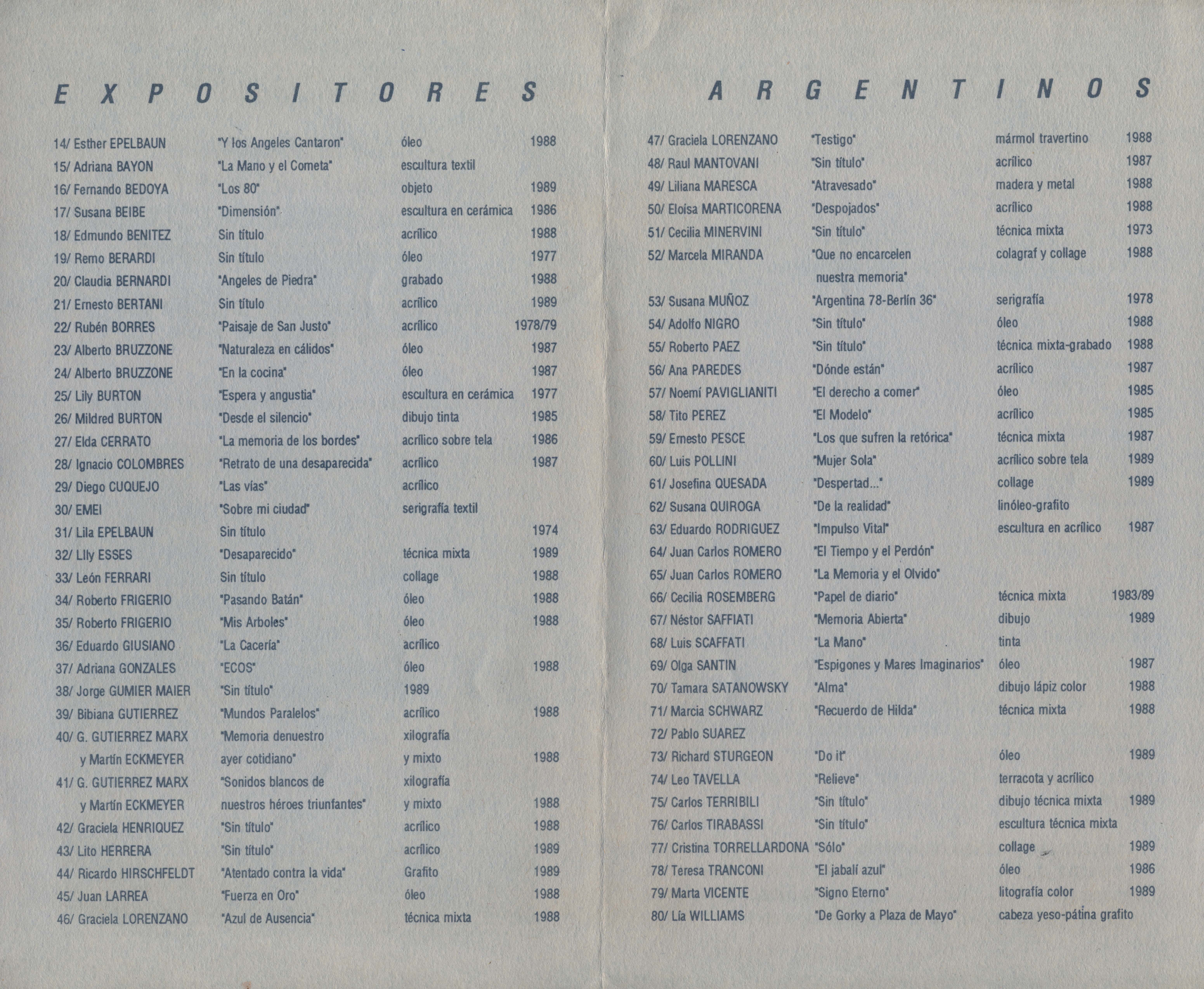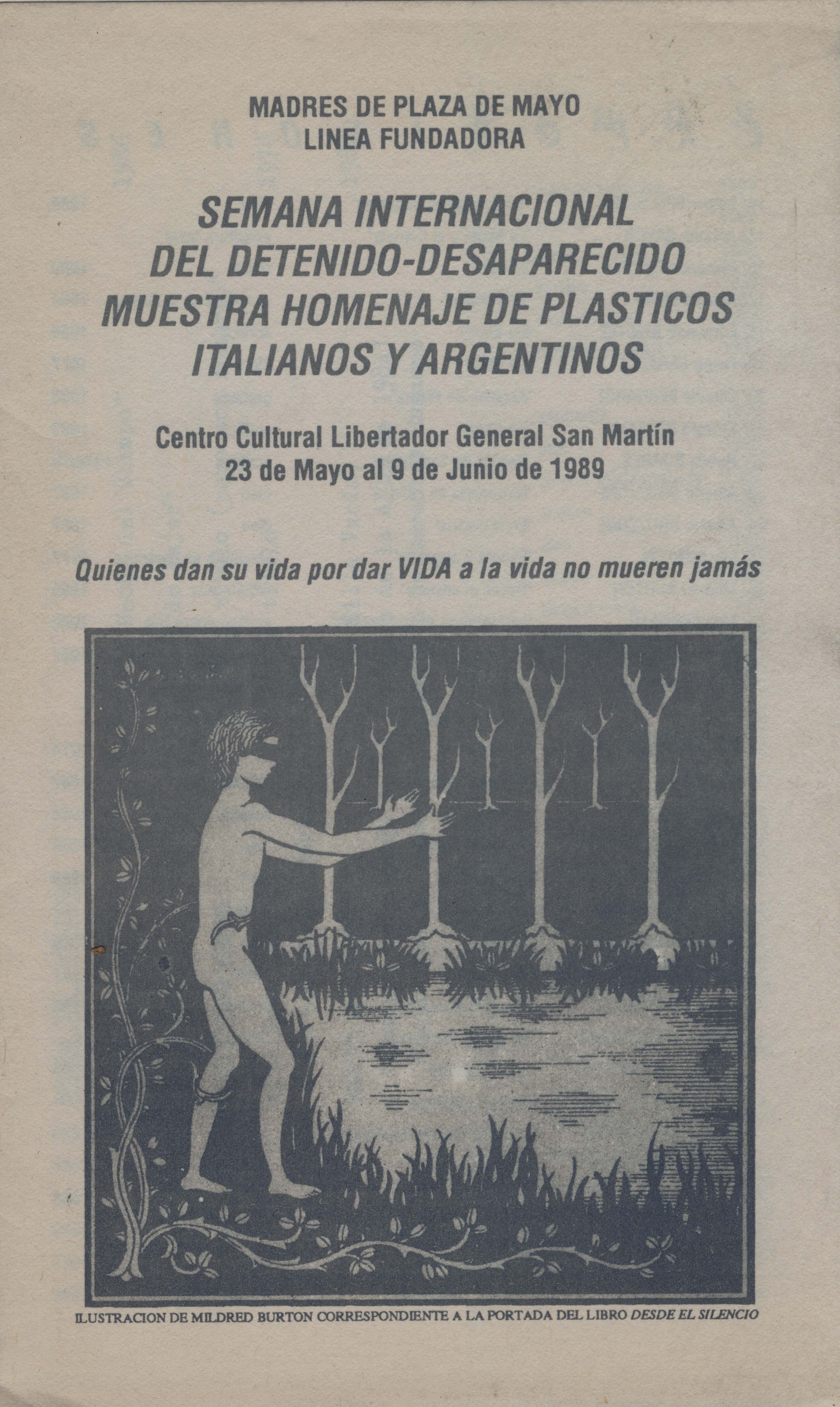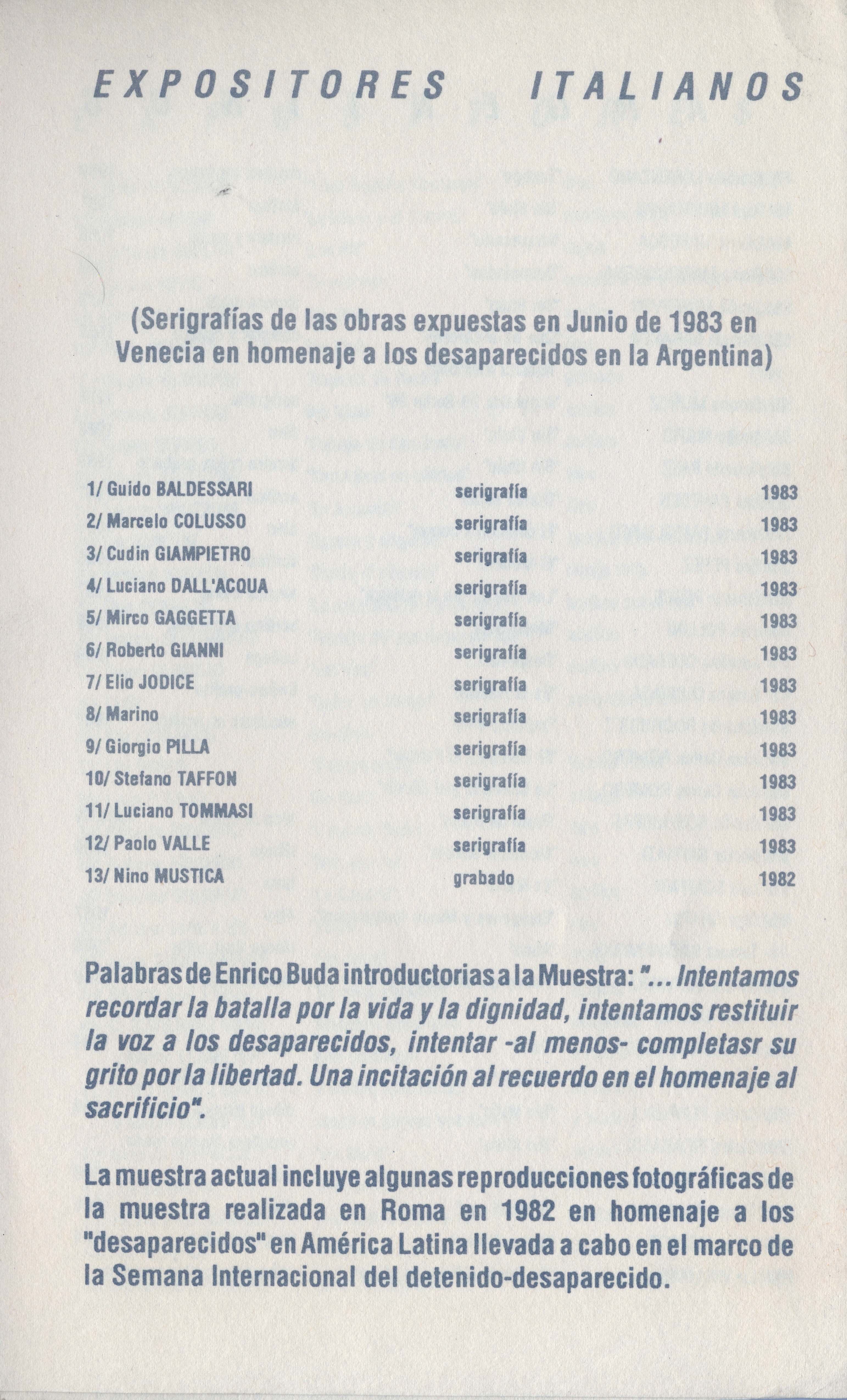 Catálogo con ilustración de Mildred Burton. Lista de expositores que hicieron grabados en homenaje a los desaparecidos durante la dictadura en Argentina y que expusieron sus obras en Venecia. Baldessari, Colusso, Giampietro, Dall'acqua, Gaggetta, Gianni, Jodice, Marino, Pilla, Taffon, Tommasi, Valle, Mustica. Fuera de catálogo: Clodion, Godell, Kexel, Lapaco, Mosterio. Expositores Argentinos: Bayon, Bedoya, Benitez, Bruzzone, Burton, Cerrato, Colombres, Ferrari, Frigerio, Gumier Maier, marx, Maresca, Nigro, Pesce, Schwartz, Scaffati.Participación de JCR con las obras "El tiempo y el Perdón", "La memoria y el olvido"