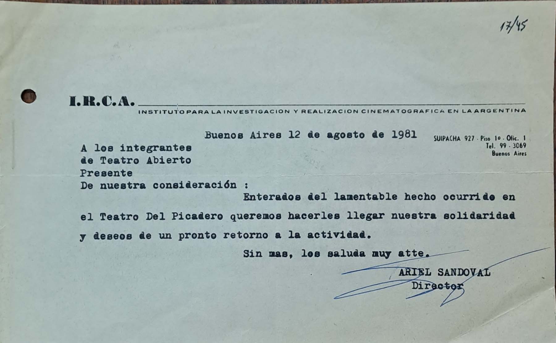 El IRCA se solidariza con Teatro Abierto ante el incendio del Teatro del Picadero. 12.08.1981.