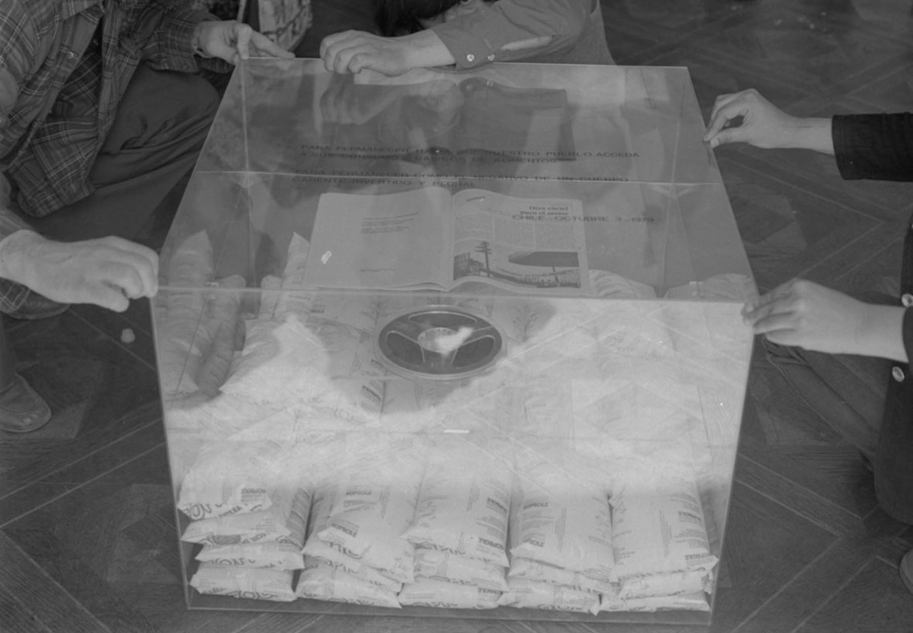 Tres personas poniendo la tapa de la caja de acrílico en la Galería Centro Imagen