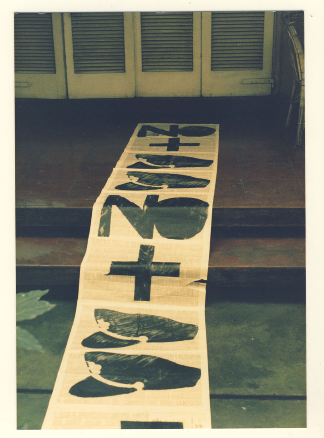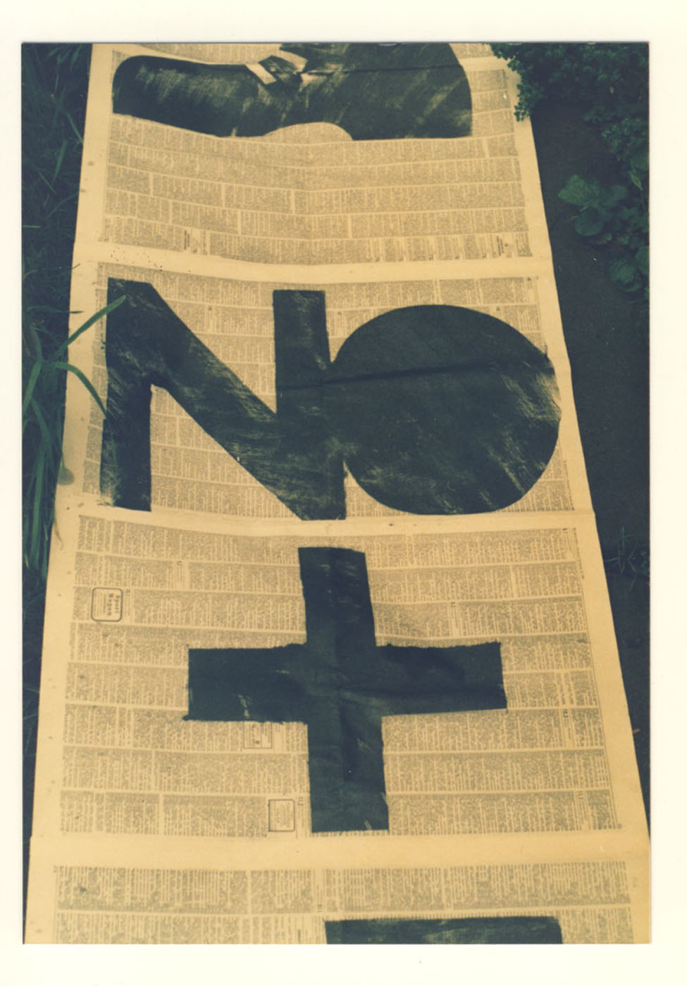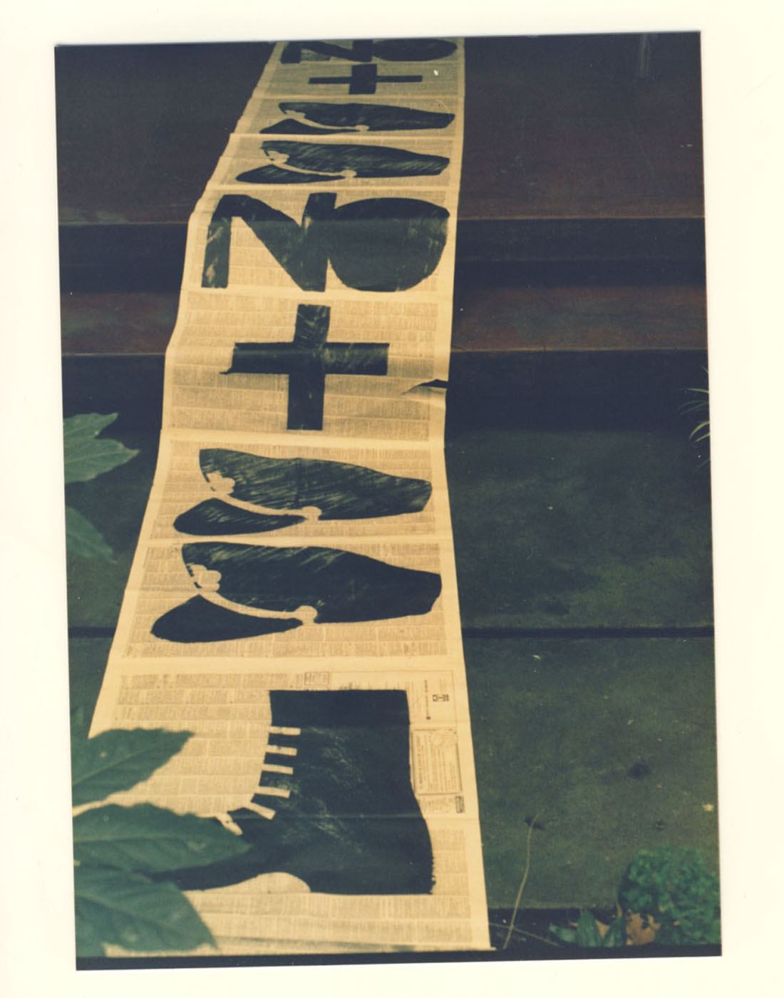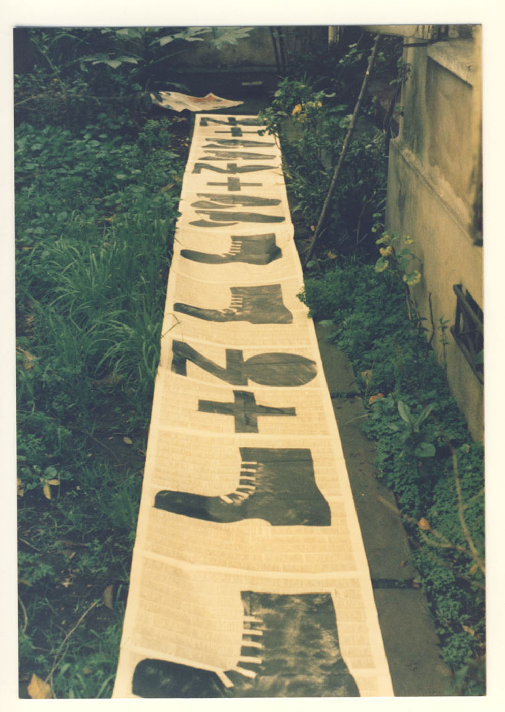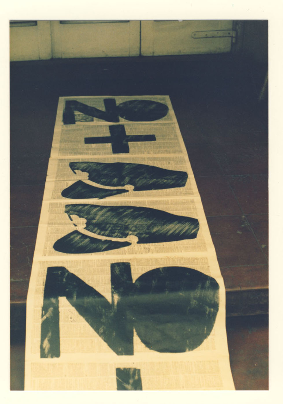 Cinta de papel periódico con una gráfica que señala No+, gorros y botines militares